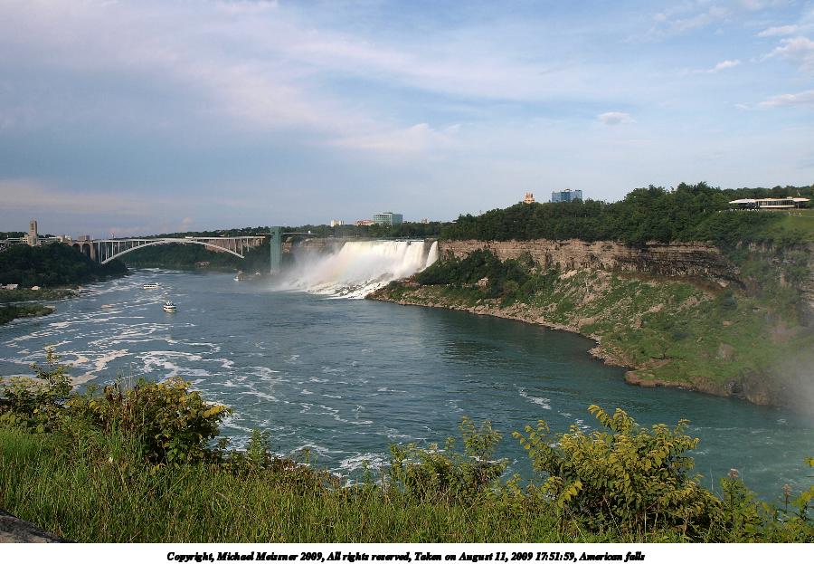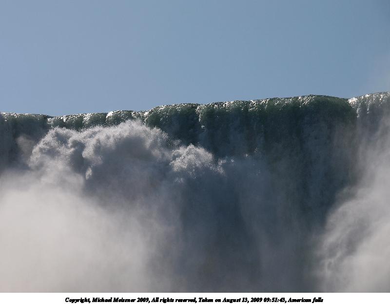 Picture #53: American falls #5 800x623, 45,792 bytes (45K), (html file) Copyright, Michael Meissner 2009, All rights reserved Olympus E-3 camera with Olympus 50-200mm f/2.8-3.5 lens f/5.0, ISO 100, 1/400 sec, 53.0mm, auto mode, natural color, auto gradation, SHQ, matrix metering, IS1 (All Direction Shake IS), noise filter low 35mm equivalent focal length 106.0mm Extra equipment used: polarizer Programs used: gimp Taken by Michael Meissner on August 13, 2009 09:54:17 Last modified on October 02, 2009 at 08:28 This picture is one of my favorites. |