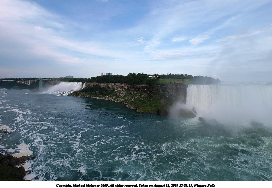 Picture #106: Niagara Falls 900x623, 125,898 bytes (123K), (html file) Copyright, Michael Meissner 2009, All rights reserved Olympus E-3 camera with Olympus 9-18mm f/4.0-5.6 lens f/8.0, ISO 100, 1/250 sec, 9.0mm, auto mode, natural color, auto gradation, SHQ, matrix metering, IS1 (All Direction Shake IS), noise filter low 35mm equivalent focal length 18.0mm Programs used: gimp Taken by Michael Meissner on August 11, 2009 17:51:23 Last modified on September 29, 2009 at 08:26 |