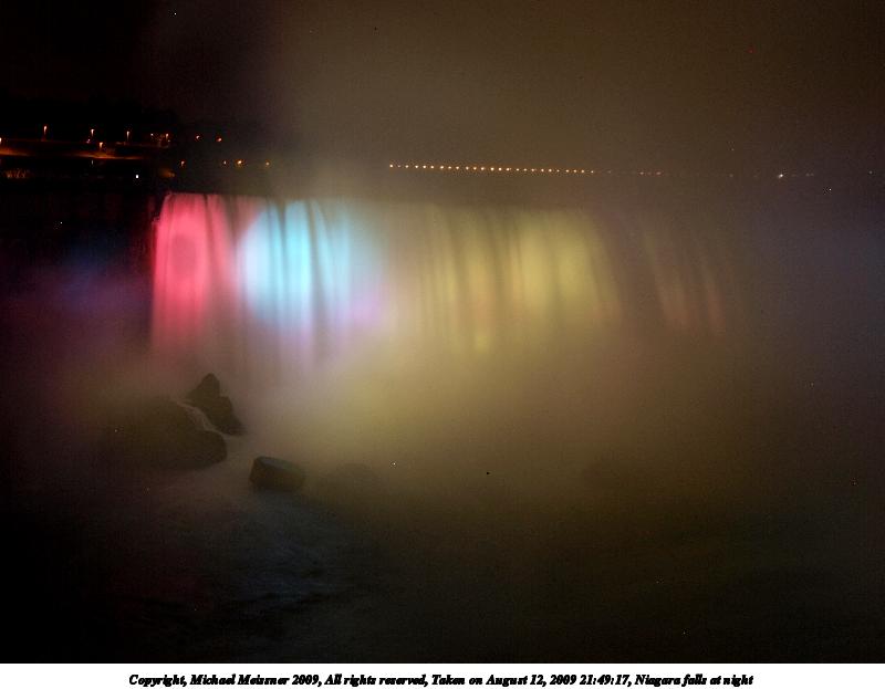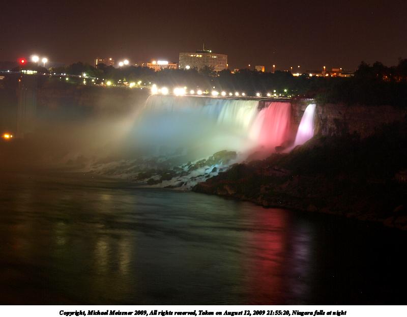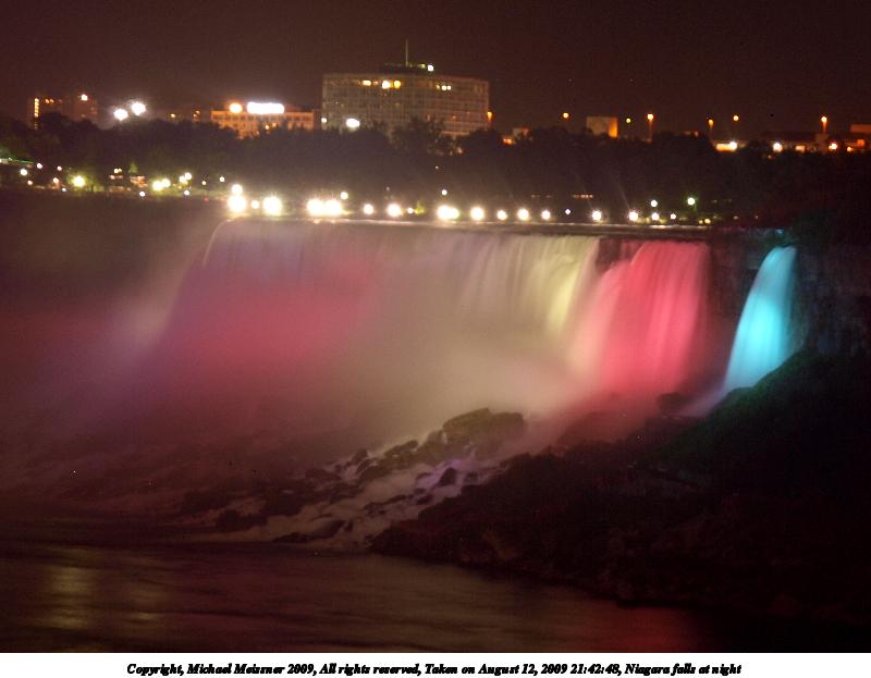 Picture #80: Niagara falls at night #3 800x623, 51,902 bytes (51K), (html file) Copyright, Michael Meissner 2009, All rights reserved Olympus E-3 camera with Olympus 14-54mm f/2.8-3.5 lens f/5.6, ISO 100, 11 sec, 41.0mm, bulb mode, natural color, SHQ, matrix metering, manual focus, noise filter low 35mm equivalent focal length 82.0mm Extra equipment used: tripod, wired shutter release Programs used: gimp Taken by Michael Meissner on August 12, 2009 21:55:20 Last modified on September 29, 2009 at 21:31 This picture is one of my favorites. |