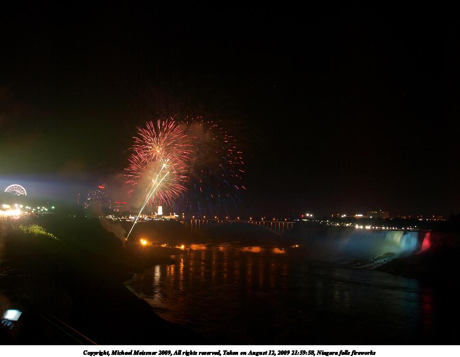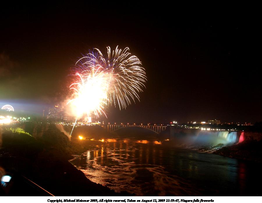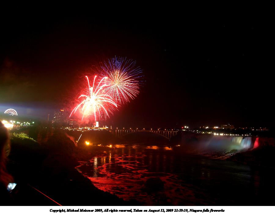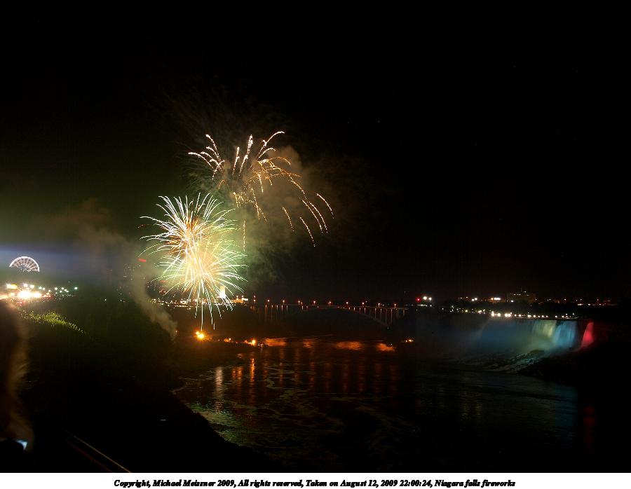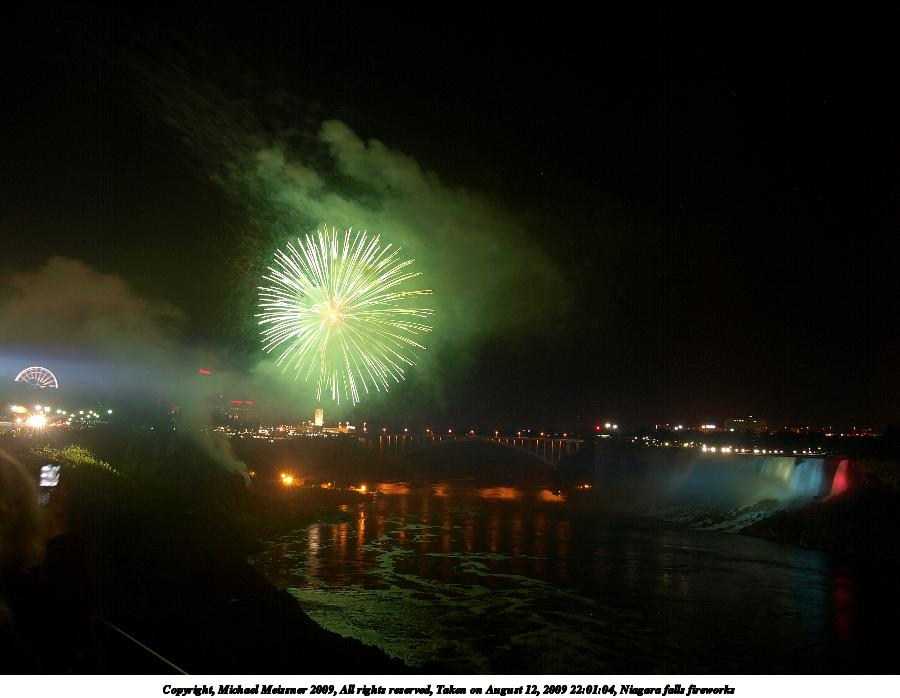 Picture #79: Niagara falls fireworks 900x698, 67,136 bytes (66K), (html file) Copyright, Michael Meissner 2009, All rights reserved Olympus E-3 camera with Olympus 14-54mm f/2.8-3.5 lens f/5.6, ISO 100, 4 sec, 17.0mm, bulb mode, natural color, SHQ, matrix metering, manual focus, noise filter low 35mm equivalent focal length 34.0mm Extra equipment used: tripod, wired shutter release Programs used: gimp Taken by Michael Meissner on August 12, 2009 21:59:39 Last modified on September 29, 2009 at 21:34 This picture is one of my favorites. |