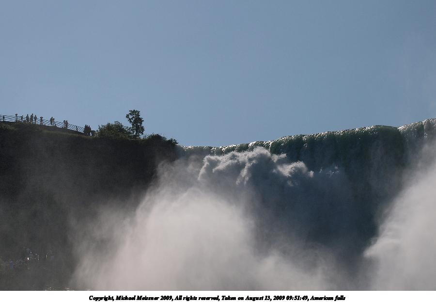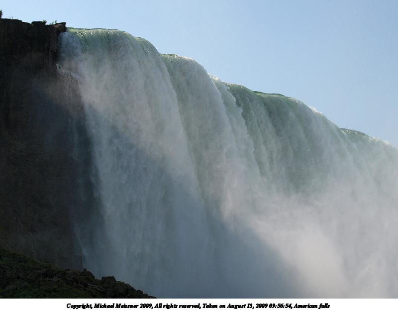 Picture #52: American falls #6 900x698, 56,120 bytes (55K), (html file) Copyright, Michael Meissner 2009, All rights reserved Olympus E-3 camera with Olympus 50-200mm f/2.8-3.5 lens f/5.6, ISO 100, 1/400 sec, 50.0mm, auto mode, natural color, auto gradation, SHQ, matrix metering, IS1 (All Direction Shake IS), noise filter low 35mm equivalent focal length 100.0mm Extra equipment used: polarizer Programs used: gimp Taken by Michael Meissner on August 13, 2009 09:54:18 Last modified on October 02, 2009 at 08:31 This picture is one of my favorites. |