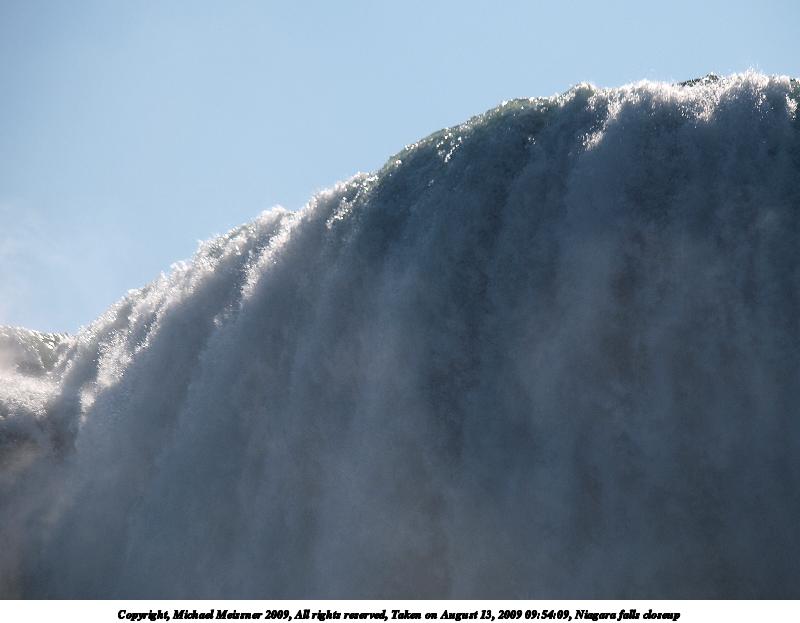 Picture #54: Niagara falls closeup 800x623, 48,910 bytes (48K), (html file) Copyright, Michael Meissner 2009, All rights reserved Olympus E-3 camera with Olympus 50-200mm f/2.8-3.5 lens f/4.5, ISO 100, 1/640 sec, 130.0mm, auto mode, natural color, auto gradation, SHQ, matrix metering, IS1 (All Direction Shake IS), noise filter low 35mm equivalent focal length 260.0mm Extra equipment used: polarizer Programs used: gimp Taken by Michael Meissner on August 13, 2009 09:54:09 Last modified on October 02, 2009 at 08:25 |