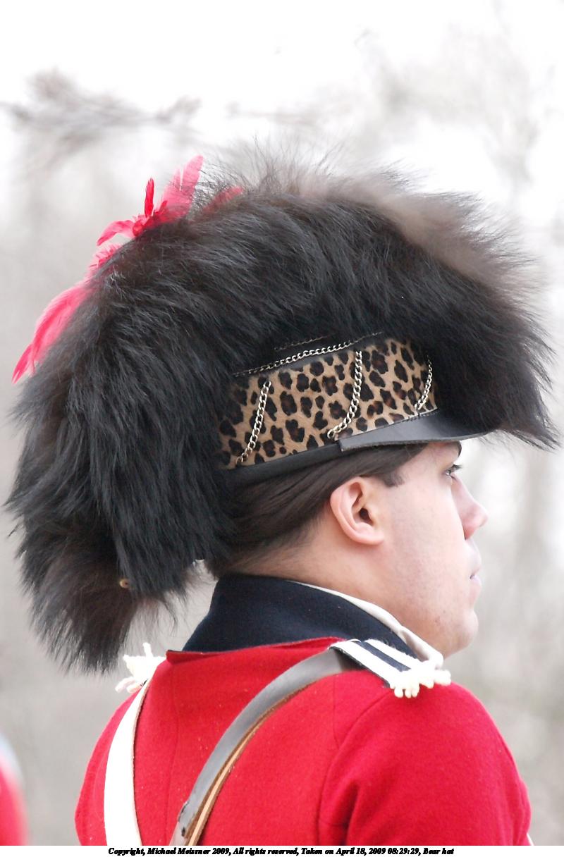 Picture #128: Bear hat 800x1216, 115,282 bytes (113K), (html file) Copyright, Michael Meissner 2009, All rights reserved Olympus E-3 camera with Olympus 50-200mm f/2.8-3.5 lens f/5.6, ISO 1000, 1/250 sec, 200.0mm, aperture priority, natural color, matrix metering, continous focus, IS1 (All Direction Shake IS) 35mm equivalent focal length 401.0mm Programs used: gimp Taken by Michael Meissner on April 18, 2009 08:29:29 Last modified on April 23, 2009 at 09:17 |
