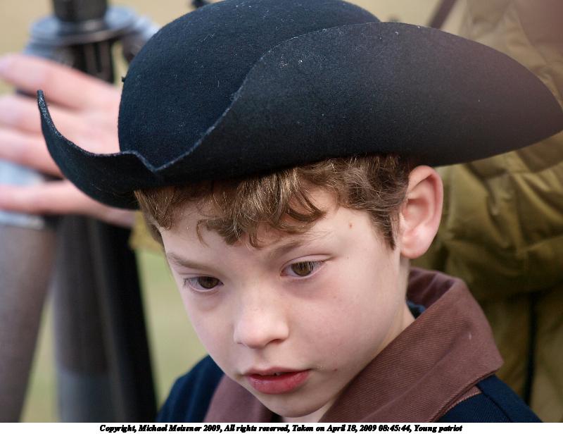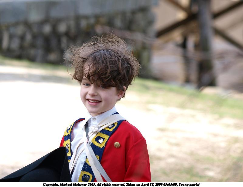 Picture #96: Young patriot #2 800x616, 63,985 bytes (63K), (html file) Copyright, Michael Meissner 2009, All rights reserved Olympus E-3 camera with Olympus 50-200mm f/2.8-3.5 lens f/3.2, ISO 100, 1/250 sec, 96.0mm, auto mode, natural color, matrix metering, bias 0.3, IS1 (All Direction Shake IS) 35mm equivalent focal length 192.0mm Programs used: gimp Taken by Michael Meissner on April 18, 2009 09:05:00 Last modified on April 24, 2009 at 08:41 |