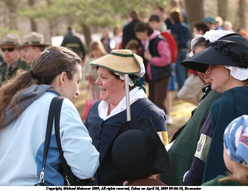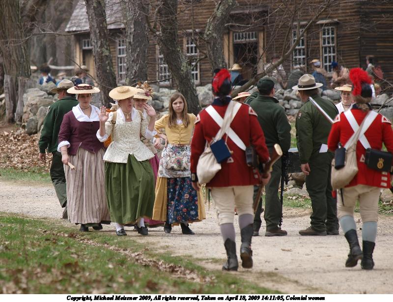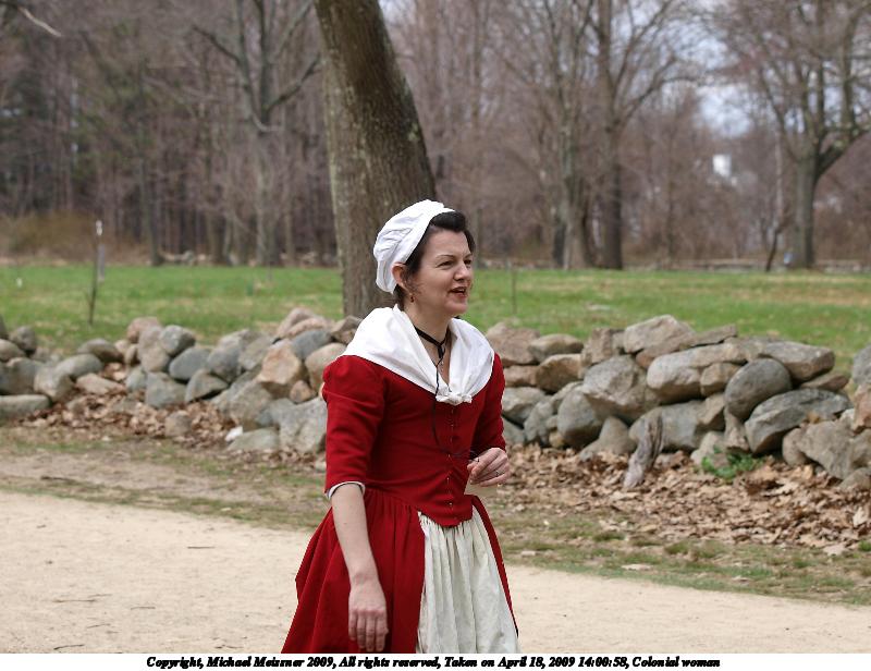 Picture #2: Colonial women #2 800x616, 119,458 bytes (117K), (html file) Copyright, Michael Meissner 2009, All rights reserved Olympus E-3 camera with Olympus 50-200mm f/2.8-3.5 lens f/4.0, ISO 100, 1/400 sec, 200.0mm, auto mode, natural color, matrix metering, IS1 (All Direction Shake IS) 35mm equivalent focal length 401.0mm Programs used: gimp Taken by Michael Meissner on April 18, 2009 14:11:30 Last modified on May 14, 2009 at 00:23 |