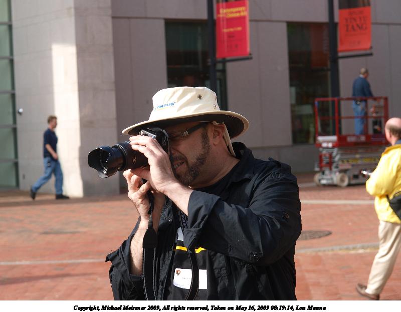 Picture #2: Lou Manna Thumb: 400x300, 48,825 bytes (48K) Small: 800x623, 81,920 bytes (80K), (html file) Copyright, Michael Meissner 2009, All rights reserved Olympus E-3 camera with Olympus 14-54mm f/2.8-3.5 lens f/5.0, ISO 100, 1/200 sec, 54.0mm, auto mode, natural color, matrix metering, IS1 (All Direction Shake IS) 35mm equivalent focal length 108.0mm Programs used: gimp Taken by Michael Meissner on May 16, 2009 08:19:14 Last modified on May 21, 2009 at 22:16 |