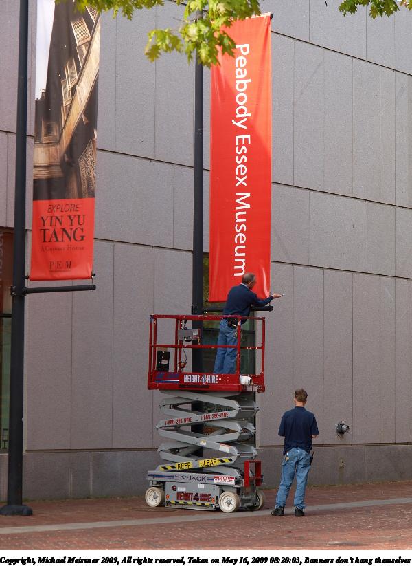 Picture #4: Banners don't hang themselves Thumb: 300x400, 50,128 bytes (49K) Small: 600x823, 103,768 bytes (102K), (html file) Copyright, Michael Meissner 2009, All rights reserved Olympus E-3 camera with Olympus 14-54mm f/2.8-3.5 lens f/4.5, ISO 100, 1/200 sec, 54.0mm, auto mode, natural color, matrix metering, IS1 (All Direction Shake IS) 35mm equivalent focal length 108.0mm Programs used: gimp, rotate Taken by Michael Meissner on May 16, 2009 08:20:03 Last modified on May 21, 2009 at 22:21 |