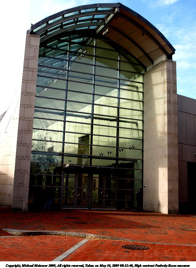 Picture #14: High contrast Peabody-Essex museum Thumb: 338x450, 63,960 bytes (63K) Small: 675x923, 146,772 bytes (144K), (html file) Copyright, Michael Meissner 2009, All rights reserved Olympus E-620 camera with Olympus 14-42mm lens f/8.0, ISO 200, 1/320 sec, 18.0mm, auto mode, natural color, matrix metering, IS1 (All Direction Shake IS), noise reduction auto 35mm equivalent focal length 36.0mm Programs used: gimp, rotate Taken by Michael Meissner on May 16, 2009 08:21:46 Last modified on May 21, 2009 at 22:40 I normally don't do much in terms of editing, but I kind of liked the effect of pushing the contrast up much higher than I usually go in post processing. |