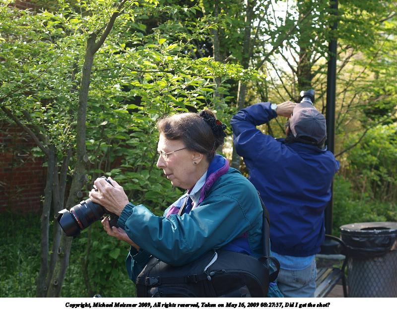 Picture #26: Did I get the shot? Thumb: 400x300, 72,857 bytes (72K) Small: 800x623, 149,794 bytes (147K), (html file) Copyright, Michael Meissner 2009, All rights reserved Olympus E-3 camera with Olympus 14-54mm f/2.8-3.5 lens f/4.0, ISO 100, 1/100 sec, 32.0mm, auto mode, natural color, matrix metering, IS1 (All Direction Shake IS) 35mm equivalent focal length 64.0mm Programs used: gimp Taken by Michael Meissner on May 16, 2009 08:27:37 Last modified on May 22, 2009 at 07:56 |