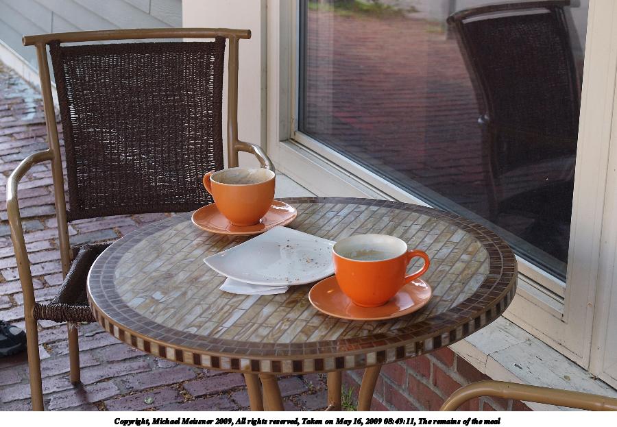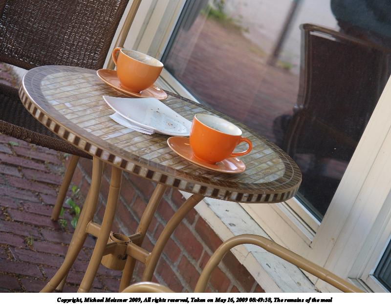Picture #41: The remains of the meal Thumb: 450x300, 60,400 bytes (59K) Small: 900x623, 131,472 bytes (129K), (html file) Copyright, Michael Meissner 2009, All rights reserved Olympus E-620 camera with Olympus 14-54mm f/2.8-3.5 lens f/4.5, ISO 200, 1/125 sec, 33.0mm, auto mode, natural color, matrix metering, IS1 (All Direction Shake IS), noise reduction auto 35mm equivalent focal length 66.0mm Programs used: gimp Taken by Michael Meissner on May 16, 2009 08:49:11 Last modified on May 23, 2009 at 23:13 |