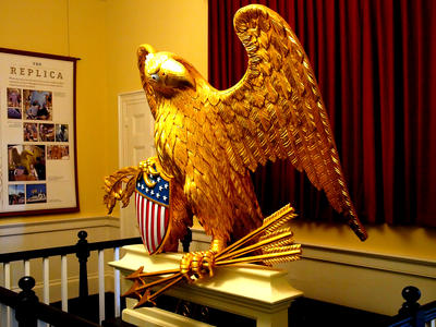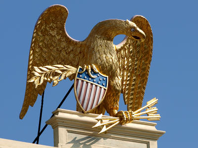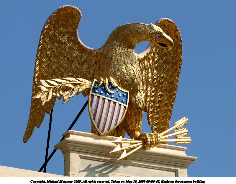 Picture #53: Eagle on the customs building Thumb: 400x300, 54,326 bytes (54K) Small: 800x623, 113,798 bytes (112K), (html file) Copyright, Michael Meissner 2009, All rights reserved Olympus E-3 camera with Olympus 70-300mm f/4.0-5.6 lens and Olympus EC-14 (1.4x) f/8.0, ISO 100, 1/400 sec, 239.0mm, auto mode, natural color, matrix metering, IS1 (All Direction Shake IS) 35mm equivalent focal length 479.0mm, EC-14 Programs used: gimp Taken by Michael Meissner on May 16, 2009 09:06:45 Last modified on May 23, 2009 at 23:36 |