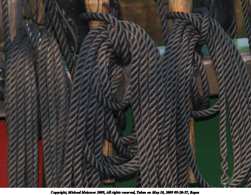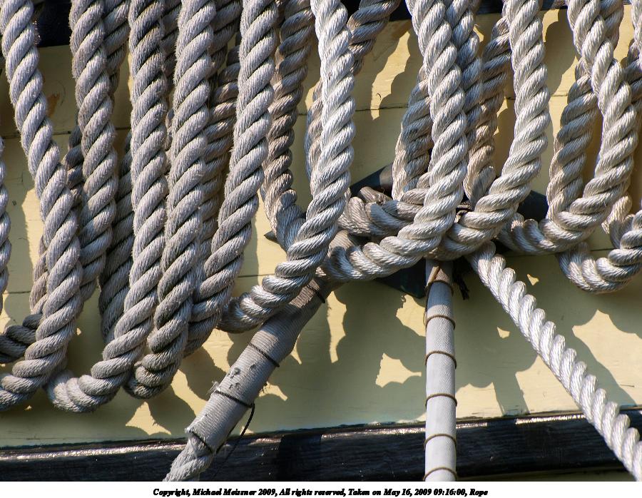 Picture #72: Ropes #2 Thumb: 400x300, 49,819 bytes (49K) Small: 800x623, 97,428 bytes (96K), (html file) Copyright, Michael Meissner 2009, All rights reserved Olympus E-3 camera with Olympus 14-54mm f/2.8-3.5 lens and Olympus EC-20 (2.0x) f/6.3, ISO 100, 1/125 sec, 54.0mm, auto mode, natural color, matrix metering, IS1 (All Direction Shake IS) 35mm equivalent focal length 108.0mm, EC-20 Programs used: gimp Taken by Michael Meissner on May 16, 2009 09:23:44 Last modified on June 05, 2009 at 01:23 |