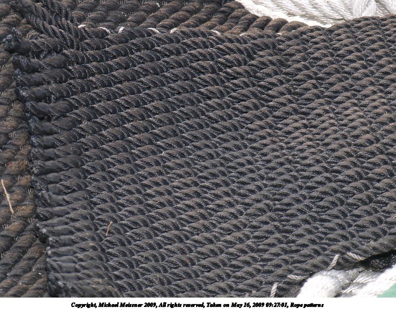 Picture #74: Rope patterns Thumb: 400x300, 67,174 bytes (66K) Small: 800x623, 180,488 bytes (177K), (html file) Copyright, Michael Meissner 2009, All rights reserved Olympus E-3 camera with Olympus 14-54mm f/2.8-3.5 lens and Olympus EC-20 (2.0x) f/6.5, ISO 100, FL-50 flash (-0.3 flash compensation), 1/160 sec, 74.0mm, auto mode, natural color, matrix metering, IS1 (All Direction Shake IS) 35mm equivalent focal length 148.0mm, EC-20 Extra equipment used: FL-50 flash Programs used: gimp Taken by Michael Meissner on May 16, 2009 09:27:01 Last modified on June 12, 2009 at 08:16 |