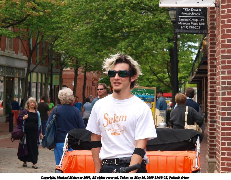 Picture #100: Pedicab driver Thumb: 400x300, 67,472 bytes (66K) Small: 800x623, 128,418 bytes (126K), (html file) Copyright, Michael Meissner 2009, All rights reserved Olympus E-3 camera with Olympus 14-54mm f/2.8-3.5 lens f/5.0, ISO 100, 1/200 sec, 54.0mm, auto mode, vivid color, matrix metering, IS1 (All Direction Shake IS) 35mm equivalent focal length 108.0mm Programs used: gimp Taken by Michael Meissner on May 16, 2009 11:39:25 Last modified on June 12, 2009 at 09:31 |