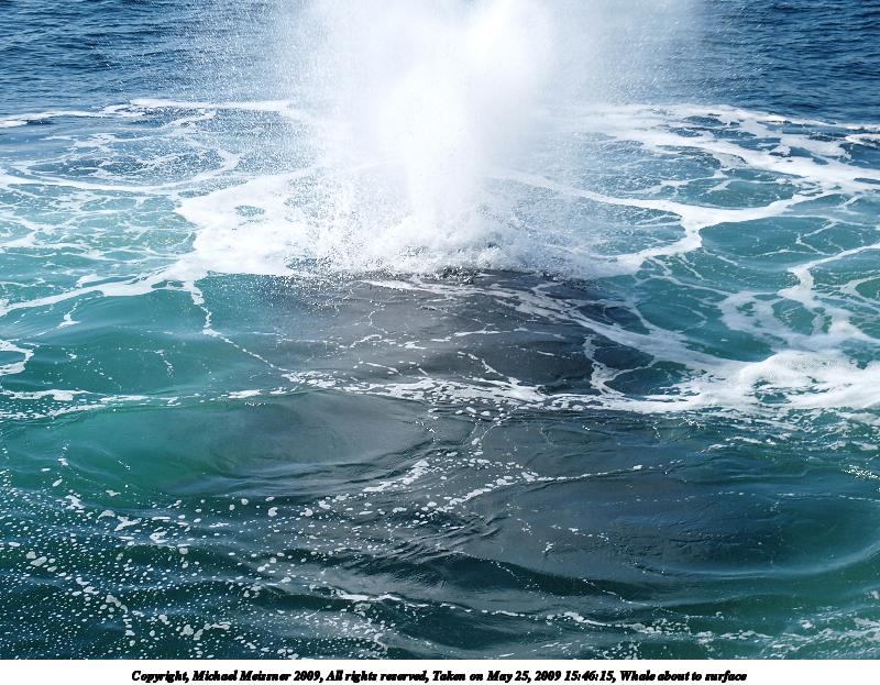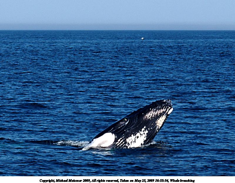 Picture #96: Whale breaching #3 800x623, 120,351 bytes (118K), (html file) Copyright, Michael Meissner 2009, All rights reserved Olympus E-1 camera with Olympus 14-54mm f/2.8-3.5 lens f/7.1, ISO 100, 1/500 sec, 54.0mm, auto mode, SHQ, center weight metering, +2 contrast, +2 sharpening 35mm equivalent focal length 108.0mm Programs used: gimp Taken by Michael Meissner on May 25, 2009 16:55:54 Last modified on June 15, 2009 at 08:36 |