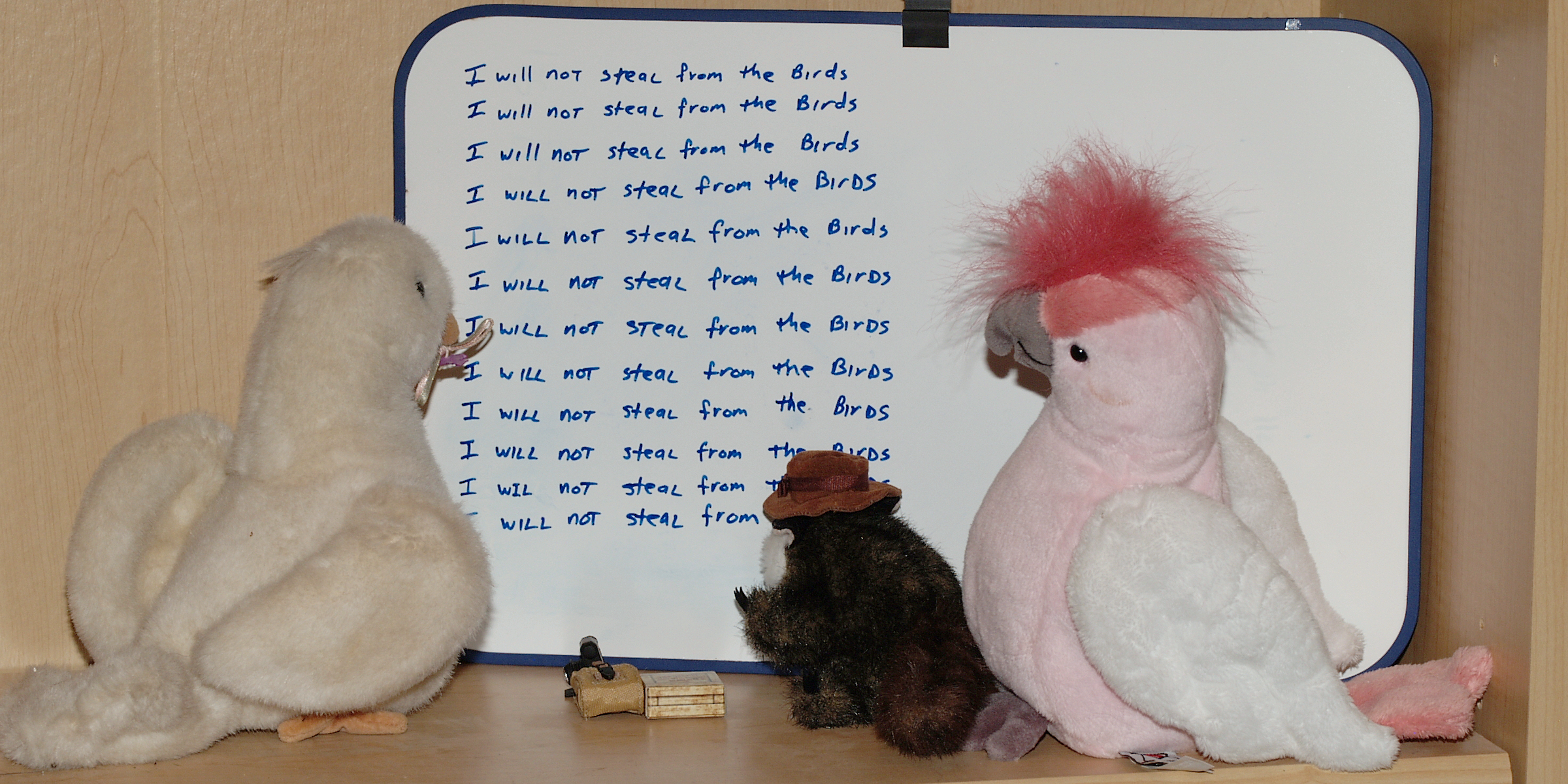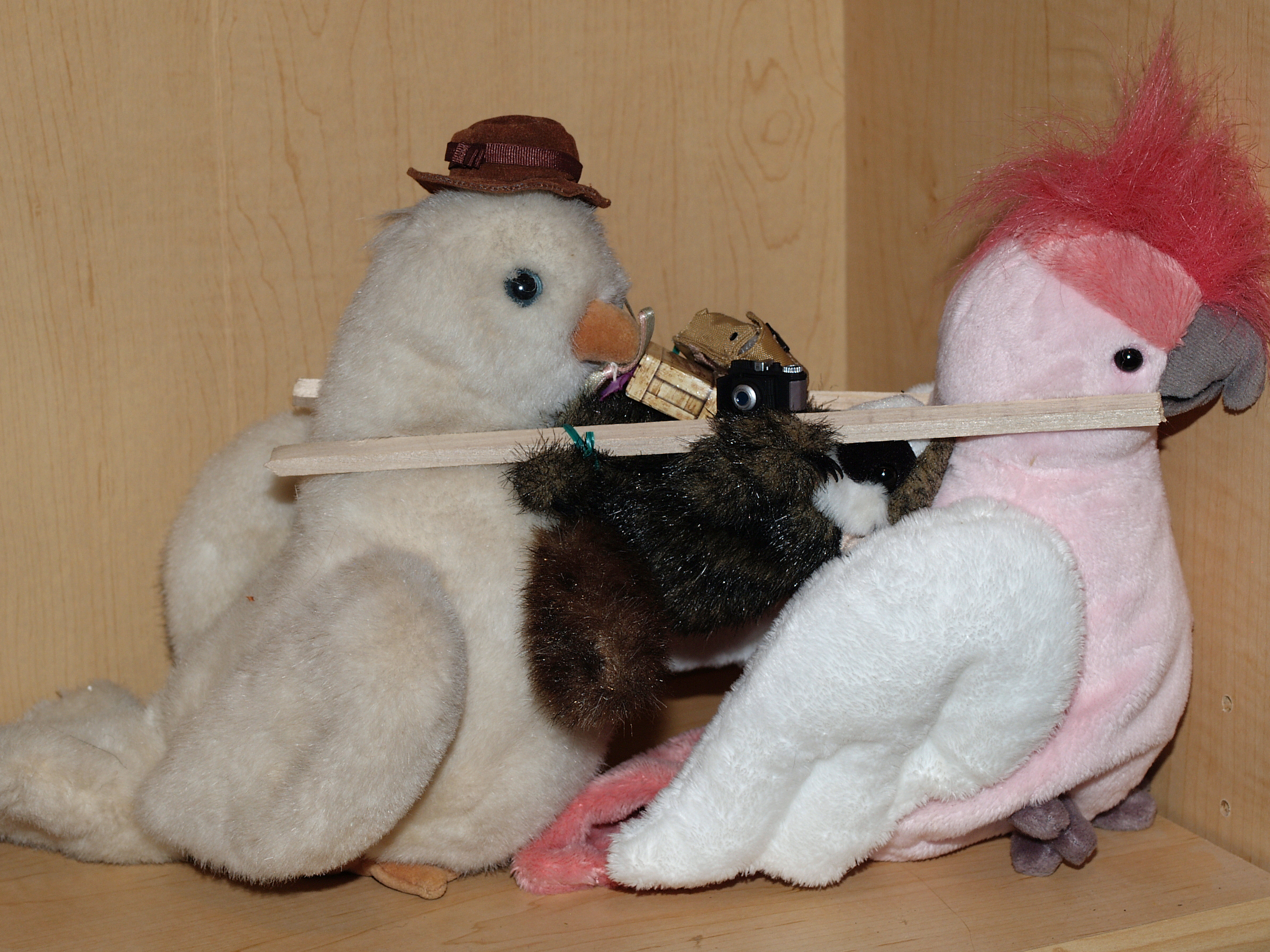 Picture #126: Help me! Small: 800x623, 77,974 bytes (77K), (html file) Large: 2400x1800, 4,374,099 bytes (4.2M), (html file) Copyright, Michael Meissner 2010, All rights reserved Olympus E-1 camera with Olympus 50mm f/2.0 lens f/5.6, ISO 100, FL-36 flash, 1/100 sec, 50.0mm, aperture priority, SHQ, matrix metering, +2 contrast, +2 sharpening 35mm equivalent focal length 100.0mm Extra equipment used: Olympus FL-36 flash Programs used: gimp Taken by Michael Meissner on October 09, 2010 11:24:41 Last modified on October 09, 2010 at 11:45 I took this picture earlier in September, but my daughter decided the birds should be wearing the hat, so I reshot it. This picture is one of my favorites. |