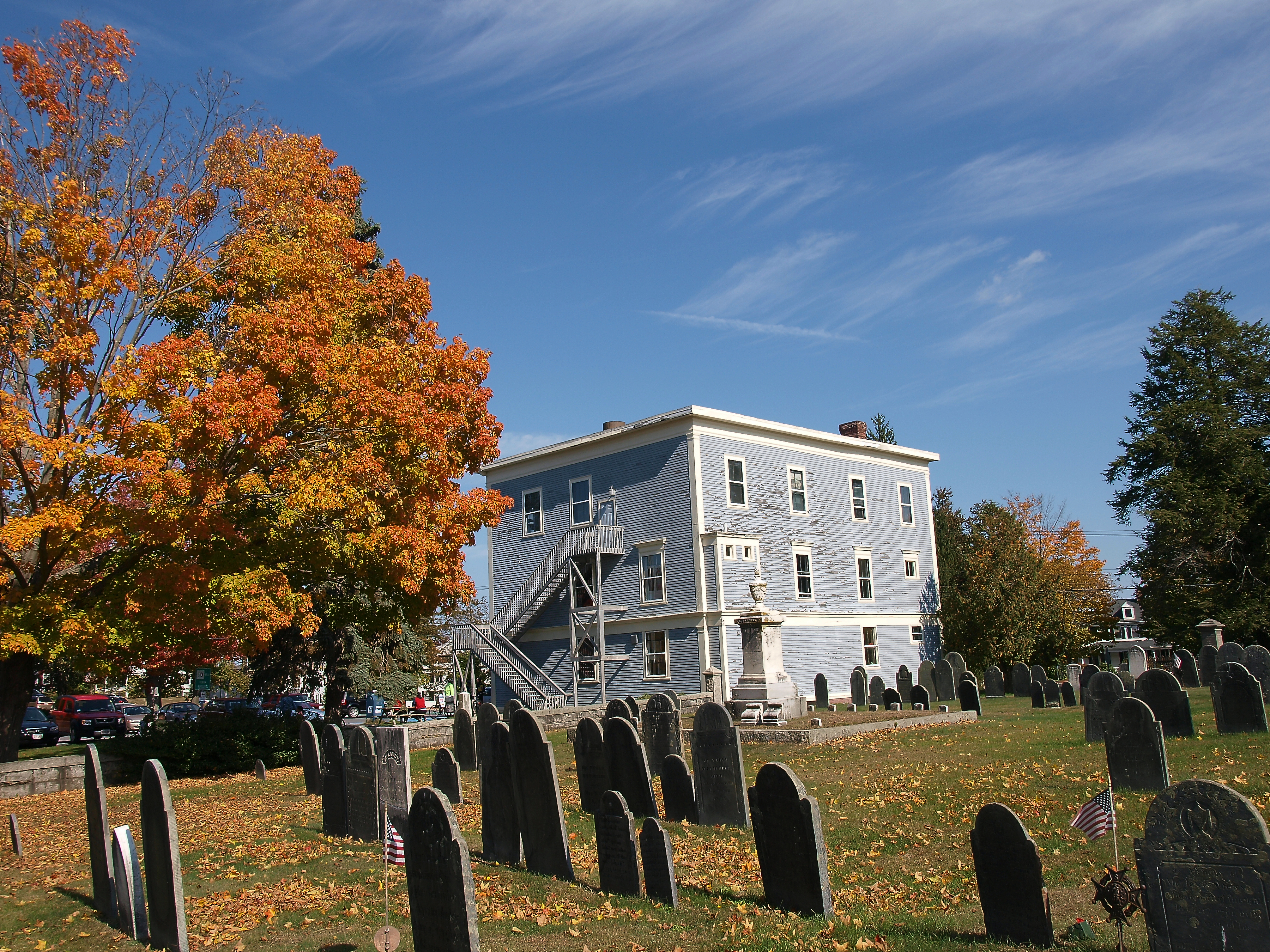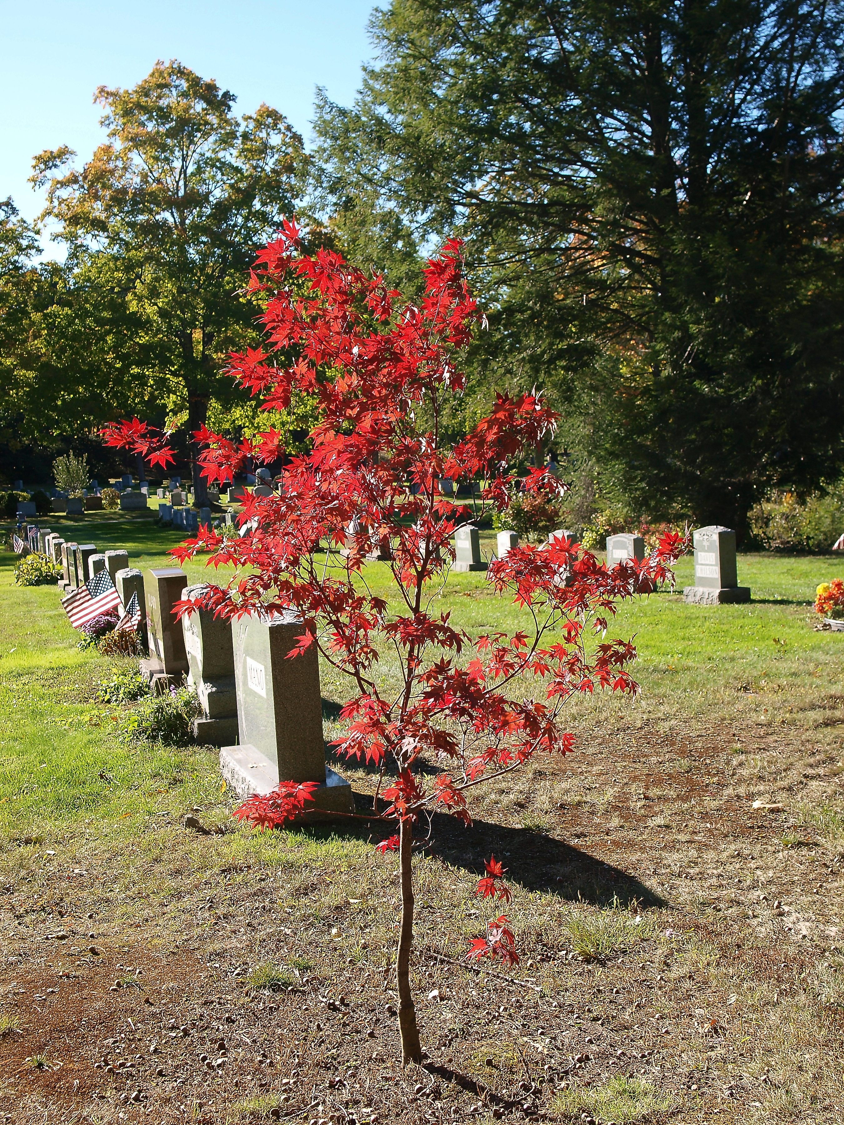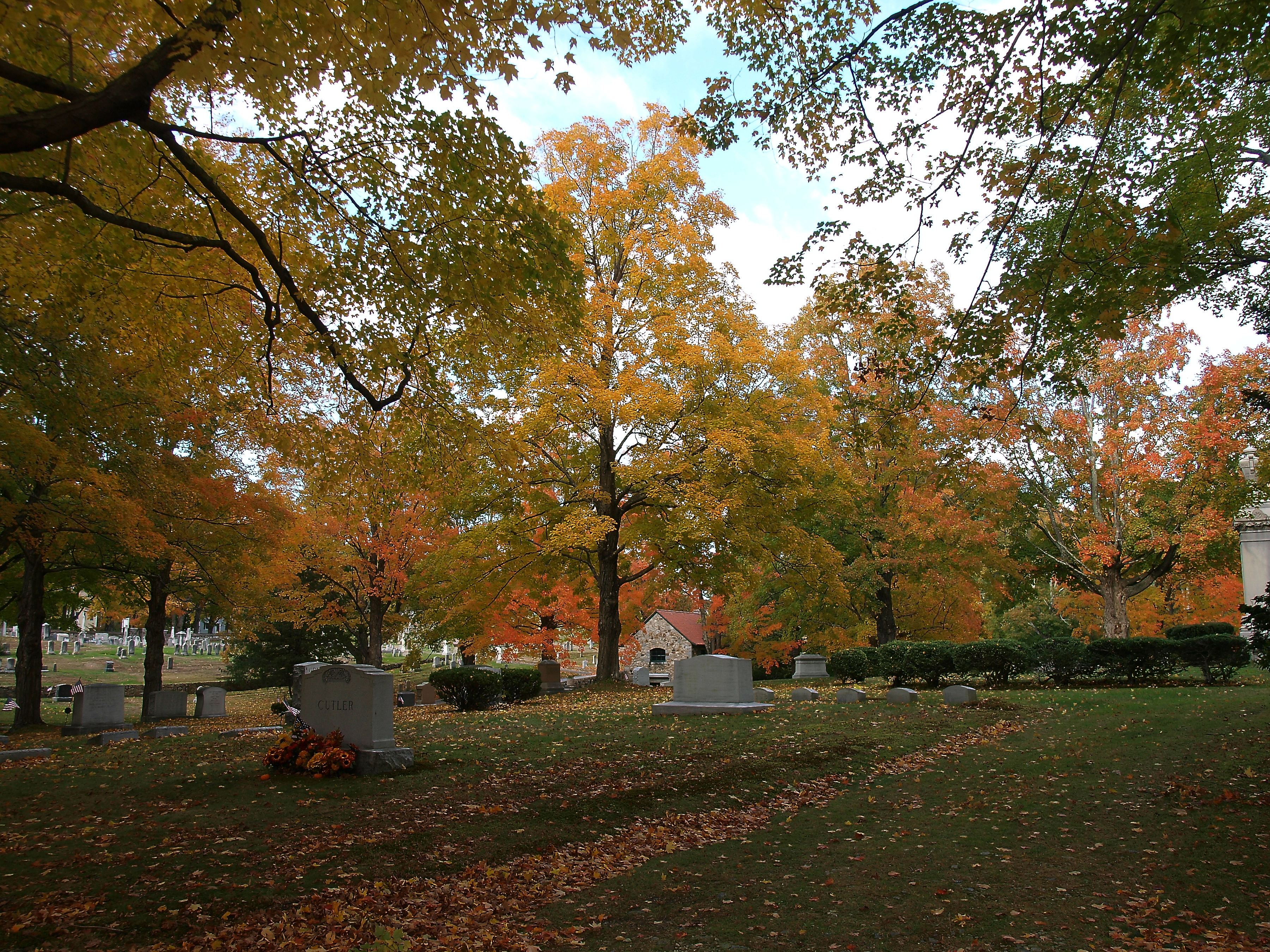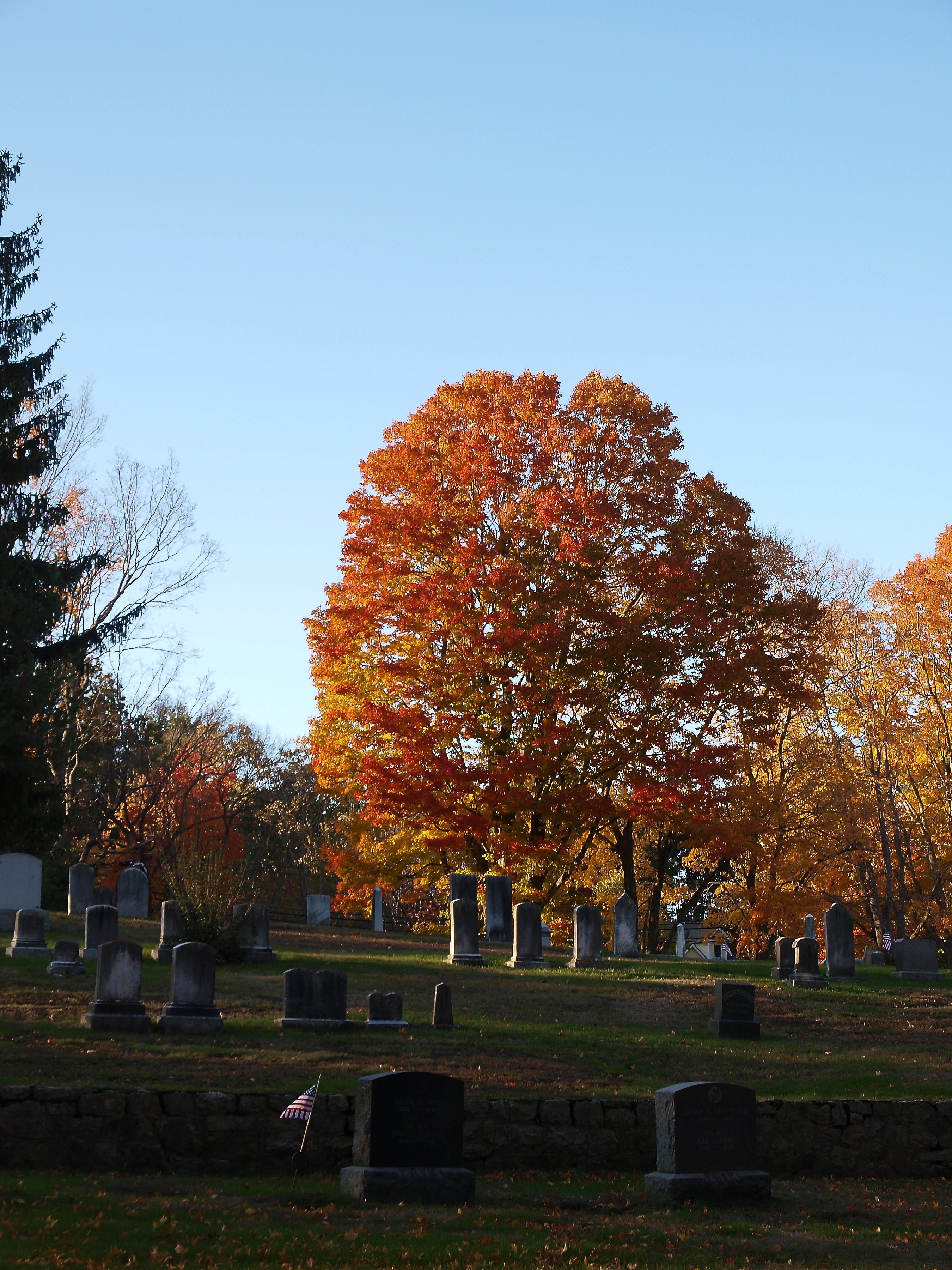Picture #101: Andover cemetary in fall #6 Small: 900x698, 186,654 bytes (183K), (html file) Large: 3600x2700, 10,886,447 bytes (11M), (html file) Copyright, Michael Meissner 2010, All rights reserved Olympus E-3 camera with Olympus 14-54mm f/2.8-3.5 lens f/3.5, ISO 250, 1/125 sec, 54.0mm, auto mode, natural color, SHQ, matrix metering, IS1 (All Direction Shake IS) 35mm equivalent focal length 108.0mm Programs used: default crop, gimp Taken by Michael Meissner on October 16, 2010 15:54:48 Last modified on October 16, 2010 at 23:37 This picture is one of my favorites. |