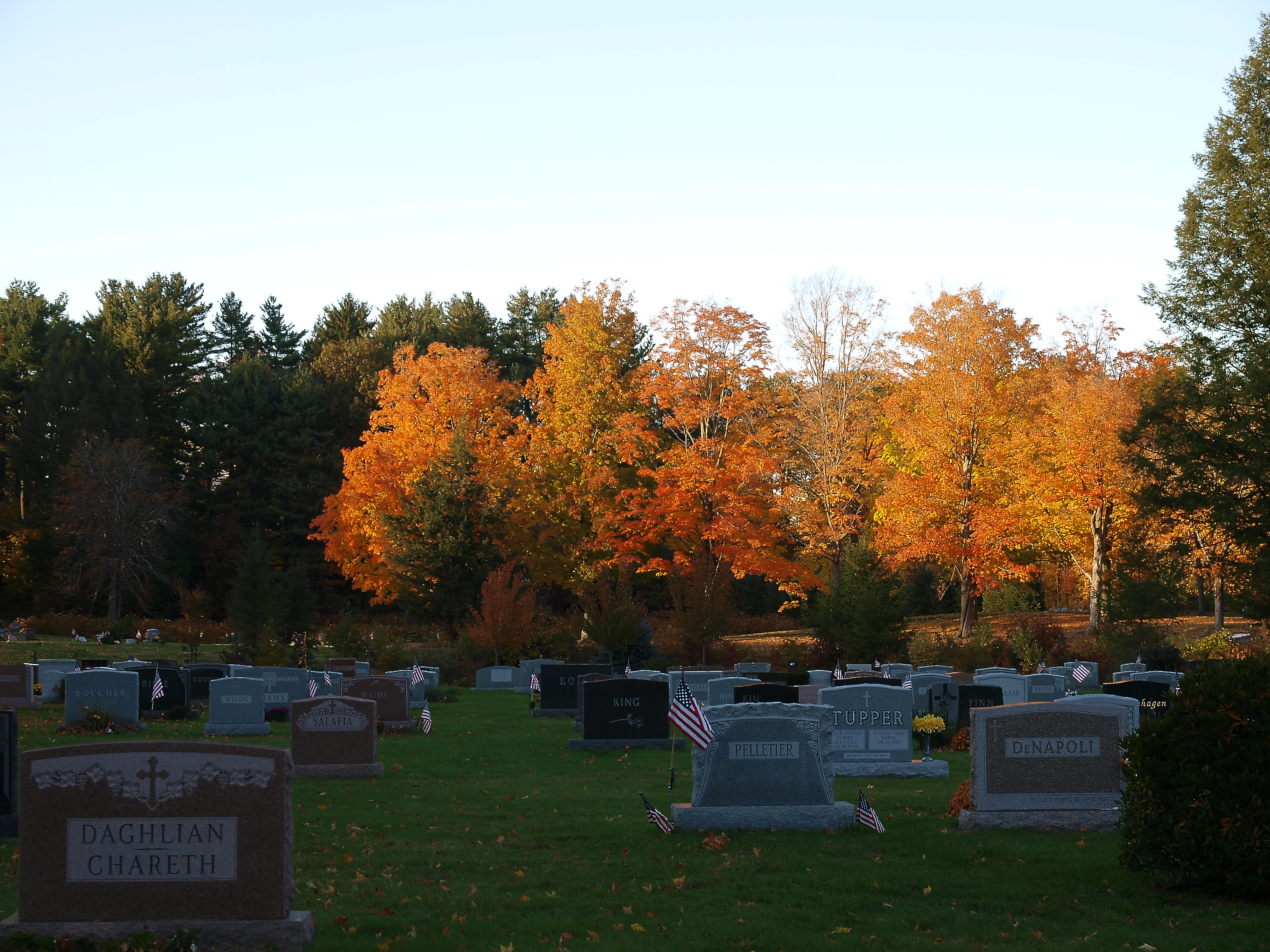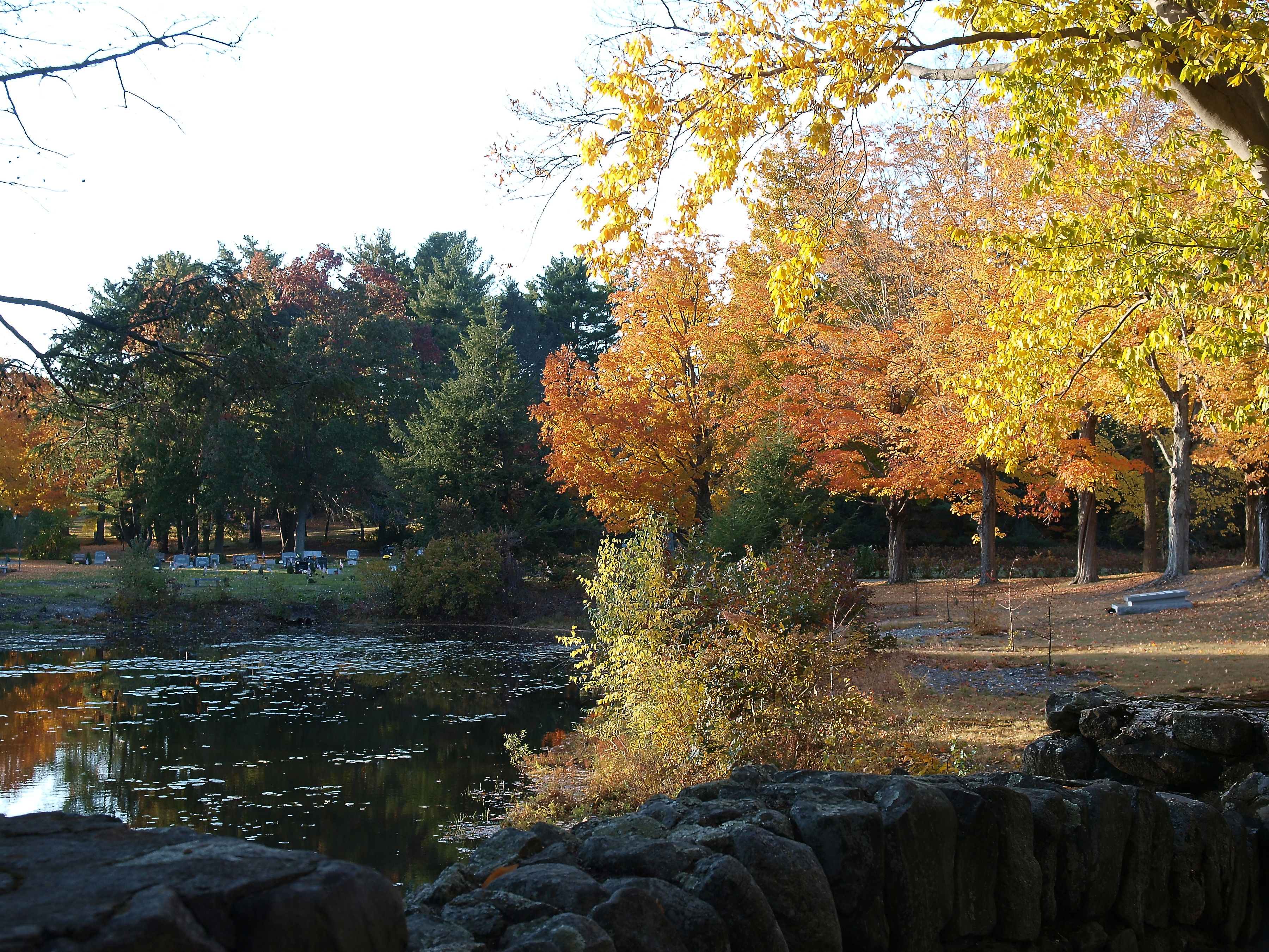 Picture #106: Andover cemetary in fall Small: 900x698, 218,993 bytes (214K), (html file) Large: 3600x2700, 11,591,743 bytes (12M), (html file) Copyright, Michael Meissner 2010, All rights reserved Olympus E-3 camera with Olympus 14-54mm f/2.8-3.5 lens f/2.8, ISO 160, 1/60 sec, 14.0mm, auto mode, natural color, SHQ, matrix metering, IS1 (All Direction Shake IS) 35mm equivalent focal length 28.0mm Programs used: default crop, gimp Taken by Michael Meissner on October 16, 2010 15:53:31 Last modified on October 16, 2010 at 23:31 |