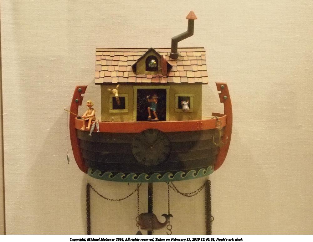 Picture #6: Noah's ark clock 1000x773, 108,093 bytes (106K), (html file) Copyright, Michael Meissner 2010, All rights reserved Olympus E-P2 camera with Olympus-m43 14-42mm f/3.5-5.6 lens f/5.4, ISO 3200, 1/40 sec, 38.0mm, auto mode, natural color, matrix metering, continous focus, IS1 (All Direction Shake IS), noise reduction auto 35mm equivalent focal length 76.0mm Programs used: gimp Taken by Michael Meissner on February 13, 2010 15:46:01 Last modified on March 25, 2010 at 22:42 |