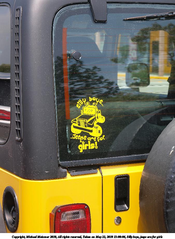 Picture #6: Silly boys, jeeps are for girls 675x923, 128,562 bytes (126K), (html file) Copyright, Michael Meissner 2010, All rights reserved Olympus E-3 camera with Olympus 14-54mm f/2.8-3.5 lens f/5.6, ISO 100, 1/250 sec, 45.0mm, auto mode, vivid color, auto gradation, matrix metering, IS1 (All Direction Shake IS) 35mm equivalent focal length 90.0mm Programs used: default crop, gimp Taken by Michael Meissner on May 22, 2010 13:00:06 Last modified on May 23, 2010 at 09:04 |