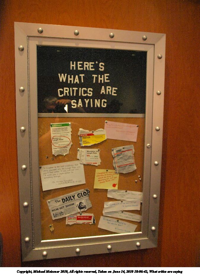 Picture #22: What critics are saying Thumb: 338x450, 42,005 bytes (42K) Small: 675x923, 118,200 bytes (116K), (html file) Copyright, Michael Meissner 2010, All rights reserved Olympus E-3 camera with Olympus 14-54mm f/2.8-3.5 lens f/2.8, ISO 2000, 1/50 sec, 14.0mm, auto mode, vivid color, auto gradation, matrix metering, IS1 (All Direction Shake IS) 35mm equivalent focal length 28.0mm Programs used: default crop, gimp Taken by Michael Meissner on June 14, 2010 18:06:42 Last modified on March 06, 2011 at 08:21 |