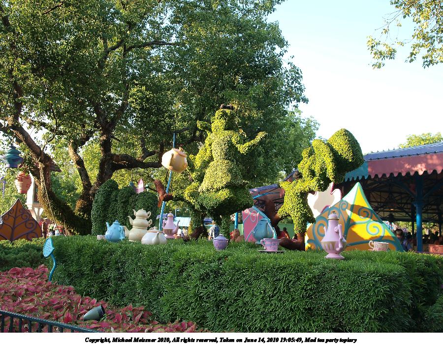 Picture #24: Mad tea party topiary Thumb: 450x338, 74,838 bytes (74K) Small: 900x698, 252,474 bytes (247K), (html file) Copyright, Michael Meissner 2010, All rights reserved Olympus E-3 camera with Olympus 14-54mm f/2.8-3.5 lens f/4.0, ISO 100, 1/125 sec, 19.0mm, auto mode, vivid color, auto gradation, matrix metering, IS1 (All Direction Shake IS) 35mm equivalent focal length 38.0mm Programs used: default crop, gimp Taken by Michael Meissner on June 14, 2010 19:05:49 Last modified on March 06, 2011 at 08:24 |