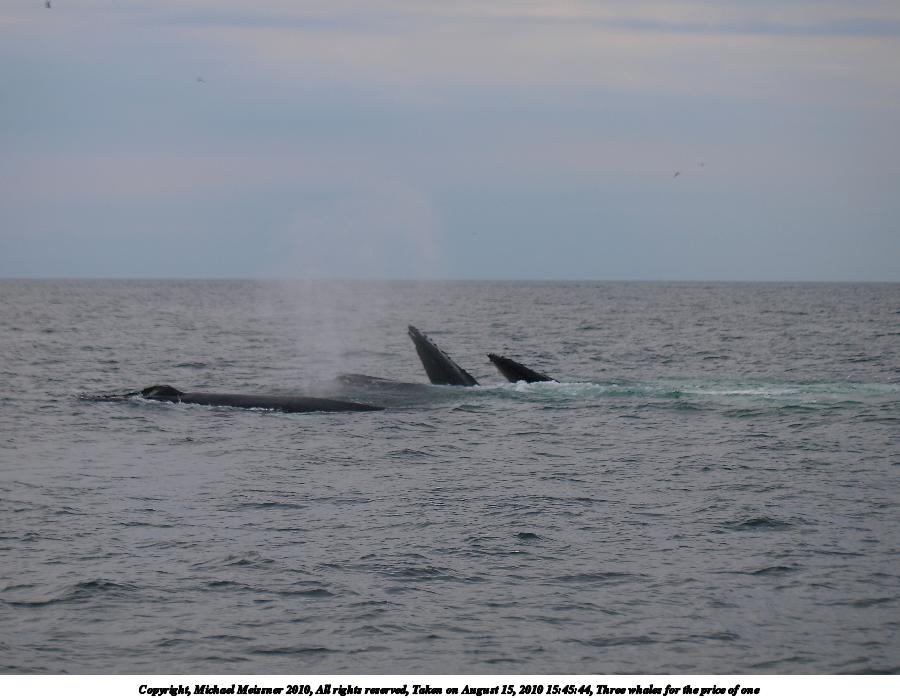 Picture #33: Three whales for the price of one Thumb: 450x338, 30,345 bytes (30K) Small: 900x698, 78,734 bytes (77K), (html file) Copyright, Michael Meissner 2010, All rights reserved Olympus E-3 camera with Olympus 50-200mm f/2.8-3.5 lens and Olympus EC-14 (1.4x) f/4.0, ISO 100, 1/1600 sec, 77.0mm, shutter priority, vivid color, matrix metering, IS1 (All Direction Shake IS) 35mm equivalent focal length 154.0mm, EC-14 Programs used: default crop, gimp Taken by Michael Meissner on August 15, 2010 15:45:44 Last modified on September 25, 2010 at 23:44 |