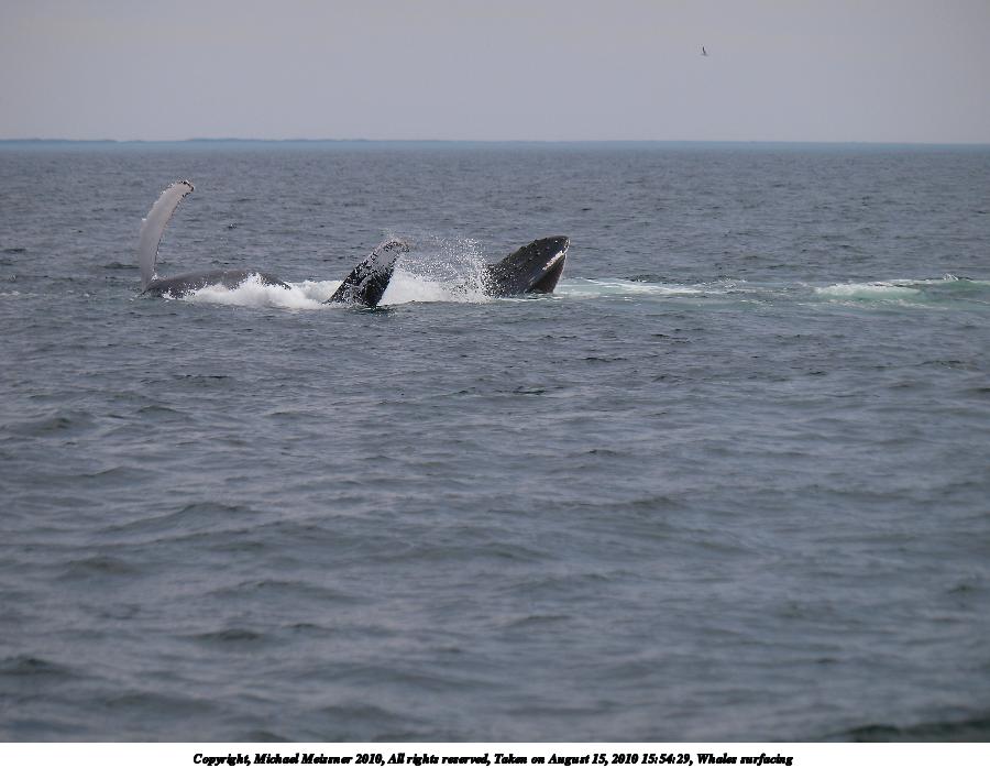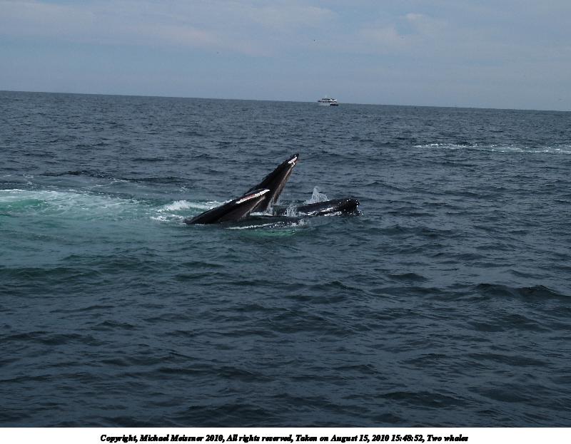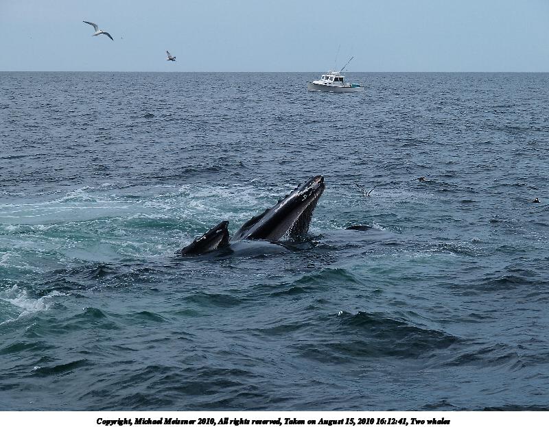 Picture #42: Whales surfacing Thumb: 450x338, 31,623 bytes (31K) Small: 900x698, 80,674 bytes (79K), (html file) Copyright, Michael Meissner 2010, All rights reserved Olympus E-3 camera with Olympus 50-200mm f/2.8-3.5 lens and Olympus EC-14 (1.4x) f/4.0, ISO 160, 1/1600 sec, 124.0mm, shutter priority, vivid color, matrix metering, IS1 (All Direction Shake IS) 35mm equivalent focal length 248.0mm, EC-14 Programs used: default crop, gimp Taken by Michael Meissner on August 15, 2010 15:54:29 Last modified on September 26, 2010 at 23:17 |