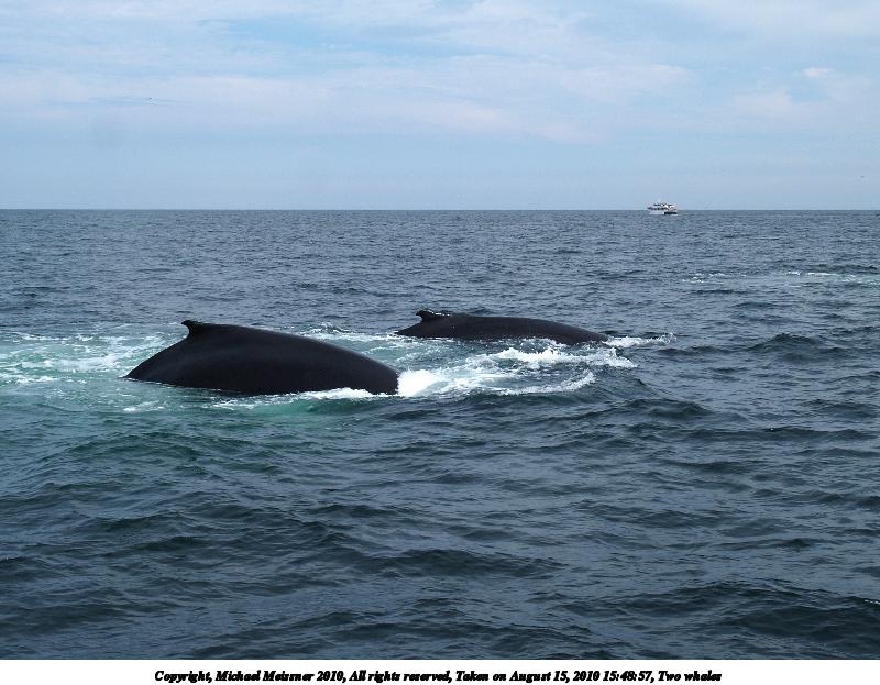 Picture #46: Two whales #3 Thumb: 480x360, 31,265 bytes (31K) Small: 800x623, 82,376 bytes (81K), (html file) Copyright, Michael Meissner 2010, All rights reserved Olympus E-1 camera with Olympus 14-54mm f/2.8-3.5 lens f/5.0, ISO 100, 1/800 sec, 52.0mm, shutter priority, SHQ, matrix metering, +2 contrast, +2 sharpening 35mm equivalent focal length 104.0mm Programs used: default crop, gimp Taken by Michael Meissner on August 15, 2010 16:06:05 Last modified on September 26, 2010 at 23:31 |