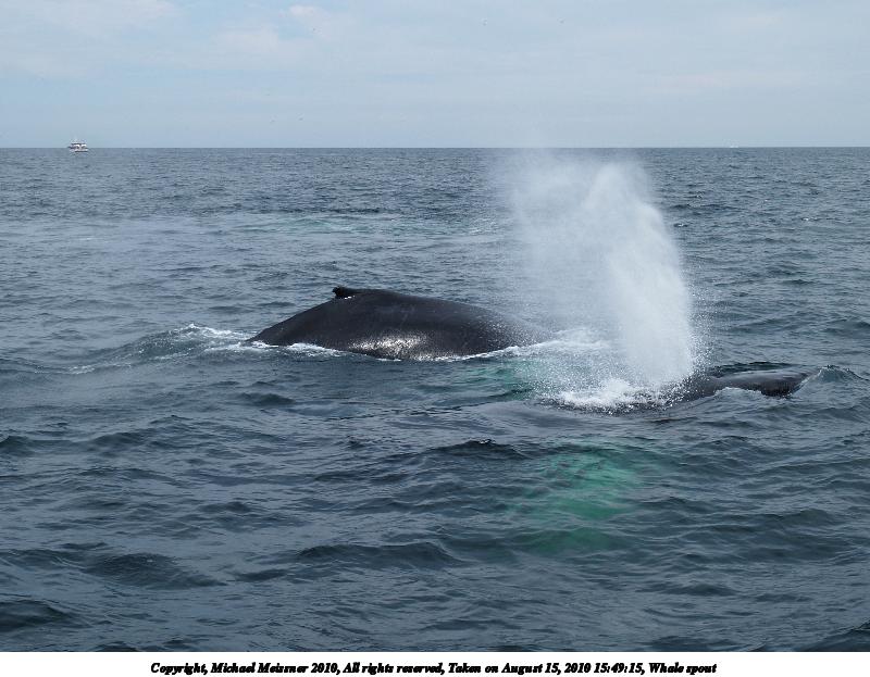 Picture #38: Whale spout Thumb: 480x360, 36,656 bytes (36K) Small: 800x623, 87,914 bytes (86K), (html file) Copyright, Michael Meissner 2010, All rights reserved Olympus E-1 camera with Olympus 14-54mm f/2.8-3.5 lens f/7.1, ISO 100, 1/320 sec, 29.0mm, auto mode, SHQ, matrix metering, +2 contrast, +2 sharpening 35mm equivalent focal length 58.0mm Programs used: gimp Taken by Michael Meissner on August 15, 2010 15:49:15 Last modified on September 26, 2010 at 23:08 |