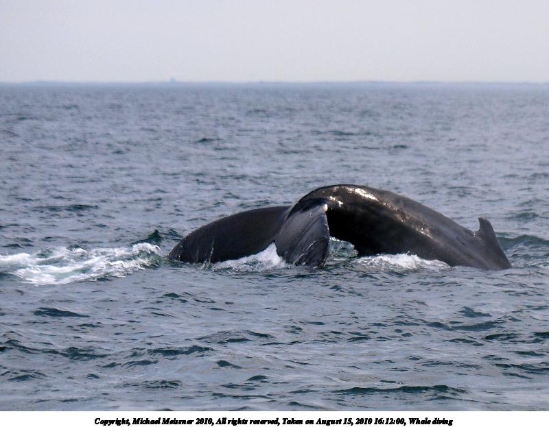Picture #49: Whale diving Thumb: 480x360, 43,591 bytes (43K) Small: 800x623, 86,280 bytes (85K), (html file) Copyright, Michael Meissner 2010, All rights reserved Olympus E-3 camera with Olympus 50-200mm f/2.8-3.5 lens and Olympus EC-14 (1.4x) f/4.0, ISO 250, 1/1600 sec, 97.0mm, shutter priority, vivid color, matrix metering, IS1 (All Direction Shake IS) 35mm equivalent focal length 194.0mm, EC-14 Programs used: gimp Taken by Michael Meissner on August 15, 2010 16:12:00 Last modified on September 26, 2010 at 23:56 |