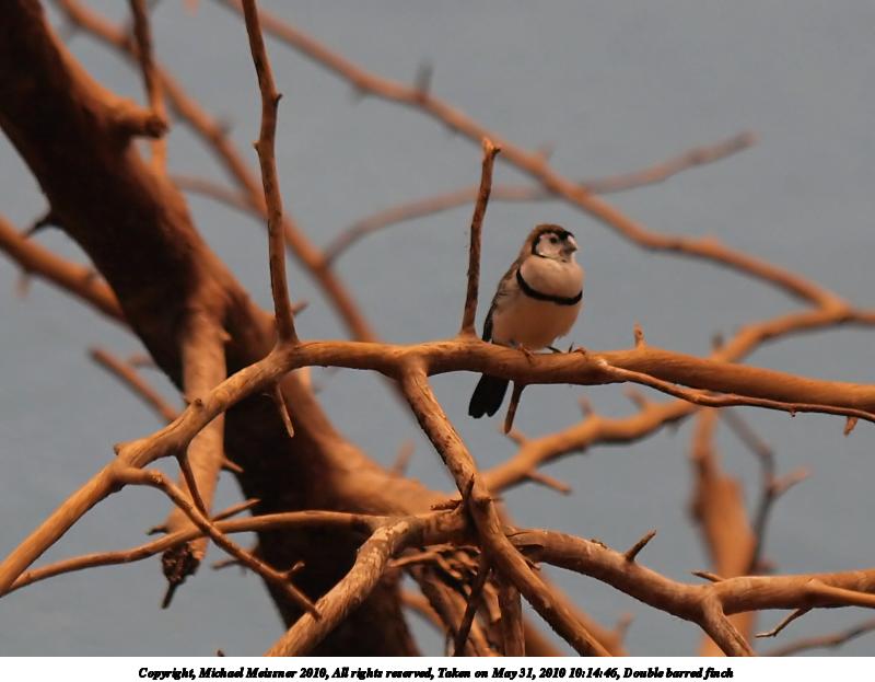 Picture #91: Double barred finch 800x623, 61,743 bytes (61K), (html file) Copyright, Michael Meissner 2010, All rights reserved Olympus E-3 camera with Olympus 50-200mm f/2.8-3.5 lens f/2.9, ISO 640, 1/250 sec, 108.0mm, auto mode, vivid color, auto gradation, matrix metering, IS1 (All Direction Shake IS) 35mm equivalent focal length 216.0mm Programs used: gimp, neatimage Taken by Michael Meissner on May 31, 2010 10:14:46 Last modified on February 21, 2011 at 14:13 |