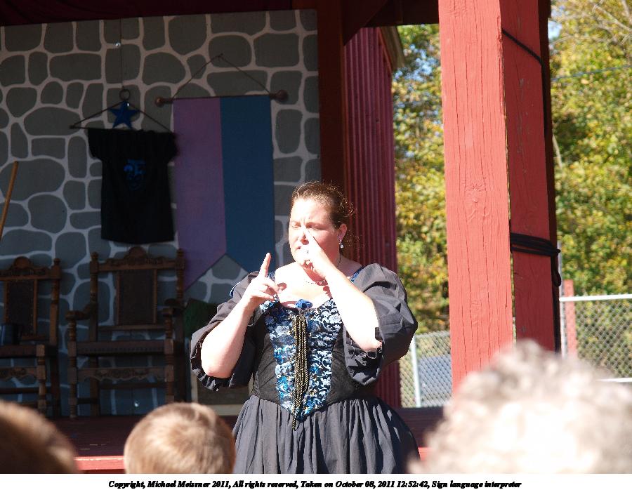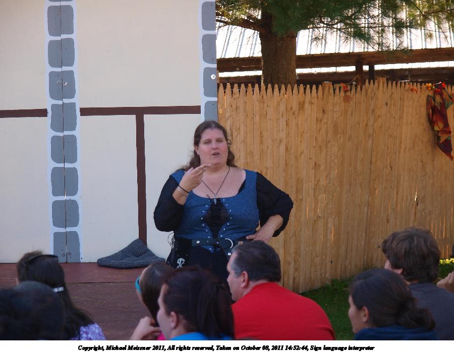 Picture #2: Sign language interpreter #2 Small: 900x698, 97,315 bytes (96K), (html file) Large: 3600x2700, 2,431,940 bytes (2.3M), (html file) Copyright, Michael Meissner 2011, All rights reserved Olympus E-3 camera with Olympus 14-54mm f/2.8-3.5 lens f/3.5, ISO 100, 1/200 sec, 52.0mm, auto mode, vivid color, SHQ, matrix metering, continous focus, IS1 (All Direction Shake IS), noise filter low 35mm equivalent focal length 104.0mm Programs used: raw therapee Taken by Michael Meissner on October 08, 2011 14:52:44 Last modified on January 29, 2012 at 18:23 |