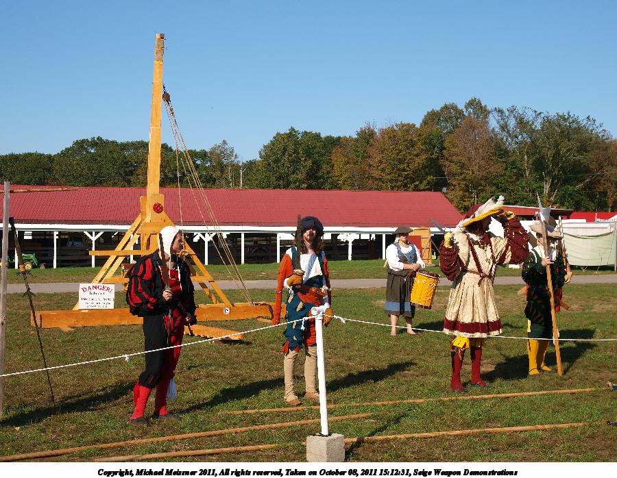 Picture #3: Seige Weapon Demonstrations #3 Small: 900x698, 193,155 bytes (189K), (html file) Large: 3600x2700, 4,187,321 bytes (4.0M), (html file) Copyright, Michael Meissner 2011, All rights reserved Olympus E-3 camera with Olympus 14-54mm f/2.8-3.5 lens f/5.6, ISO 100, 1/800 sec, 47.0mm, auto mode, vivid color, SHQ, matrix metering, continous focus, IS1 (All Direction Shake IS), noise filter low 35mm equivalent focal length 94.0mm Programs used: raw therapee Taken by Michael Meissner on October 08, 2011 15:14:20 Last modified on January 29, 2012 at 18:44 |
