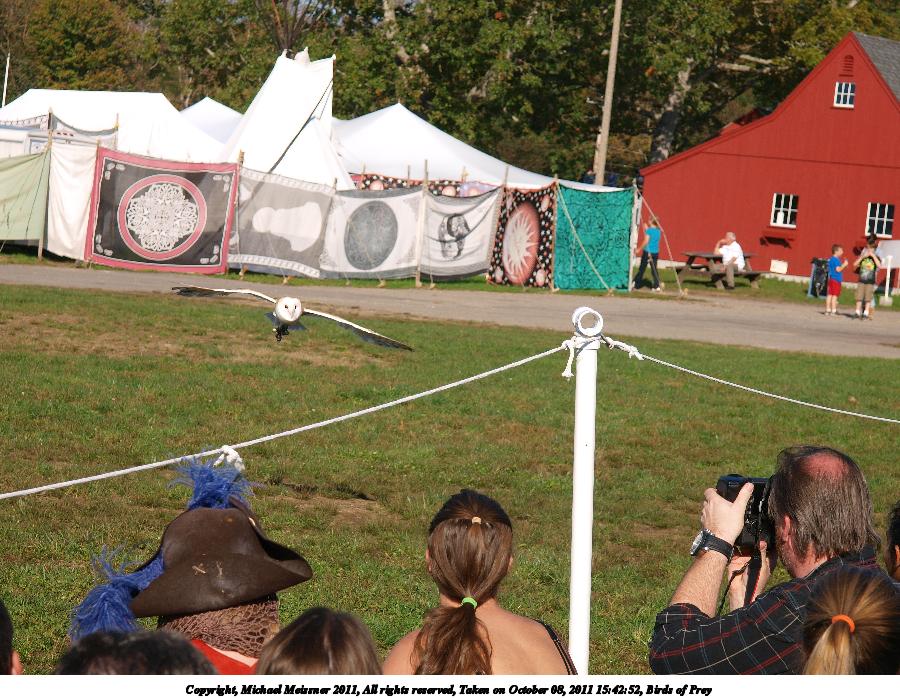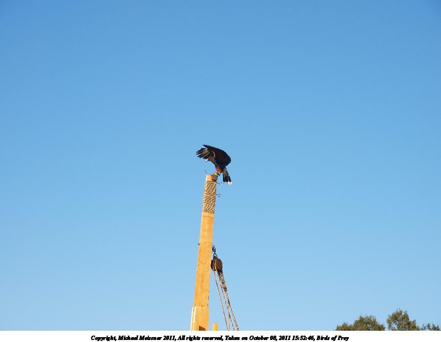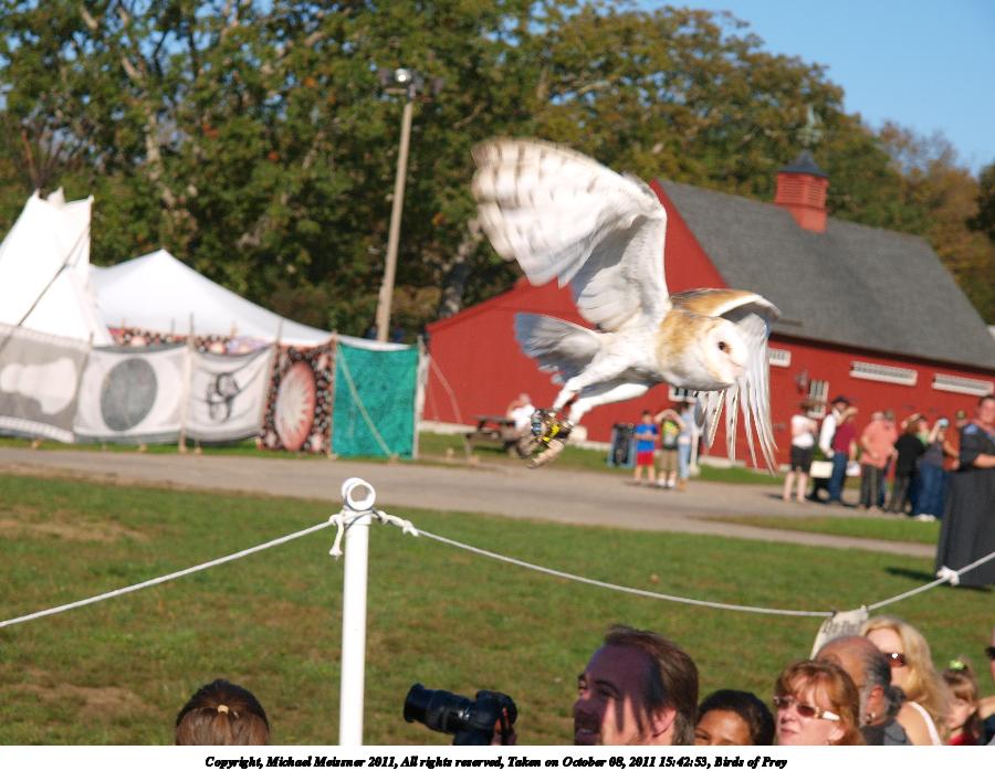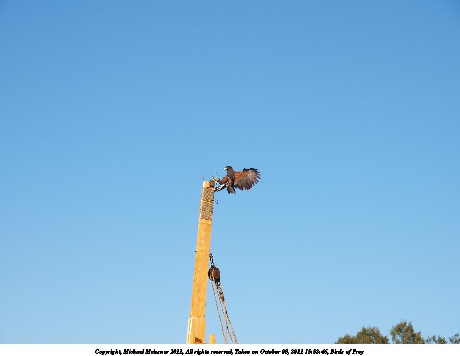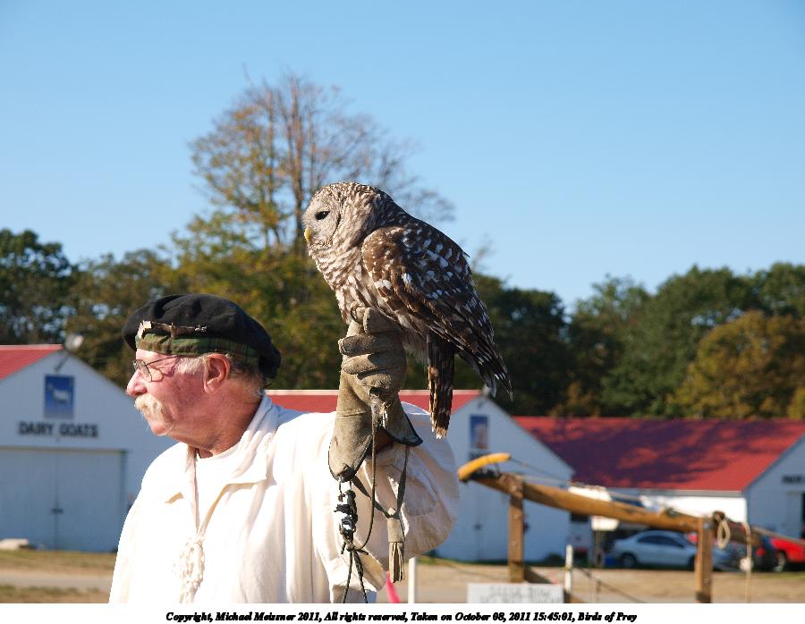 Picture #5: Birds of Prey Small: 900x698, 213,442 bytes (209K), (html file) Large: 3600x2700, 4,757,618 bytes (4.5M), (html file) Copyright, Michael Meissner 2011, All rights reserved Olympus E-3 camera with Olympus 14-54mm f/2.8-3.5 lens f/7.1, ISO 100, 1/400 sec, 54.0mm, auto mode, vivid color, SHQ, matrix metering, continous focus, IS1 (All Direction Shake IS), noise filter low 35mm equivalent focal length 108.0mm Programs used: raw therapee Taken by Michael Meissner on October 08, 2011 15:52:00 Last modified on January 29, 2012 at 18:52 |