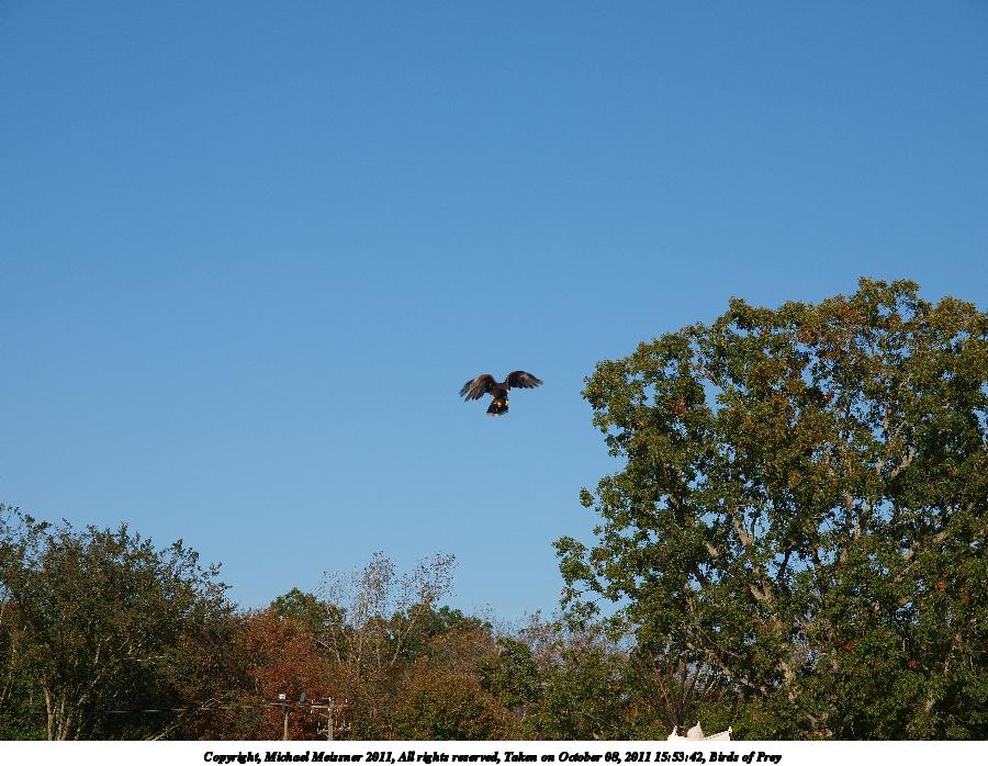Picture #8: Birds of Prey #8 Small: 900x698, 175,632 bytes (172K), (html file) Large: 3600x2700, 3,770,231 bytes (3.6M), (html file) Copyright, Michael Meissner 2011, All rights reserved Olympus E-3 camera with Olympus 14-54mm f/2.8-3.5 lens f/7.1, ISO 100, 1/400 sec, 54.0mm, auto mode, vivid color, SHQ, matrix metering, continous focus, IS1 (All Direction Shake IS), noise filter low 35mm equivalent focal length 108.0mm Programs used: raw therapee Taken by Michael Meissner on October 08, 2011 15:40:24 Last modified on January 29, 2012 at 18:48 |