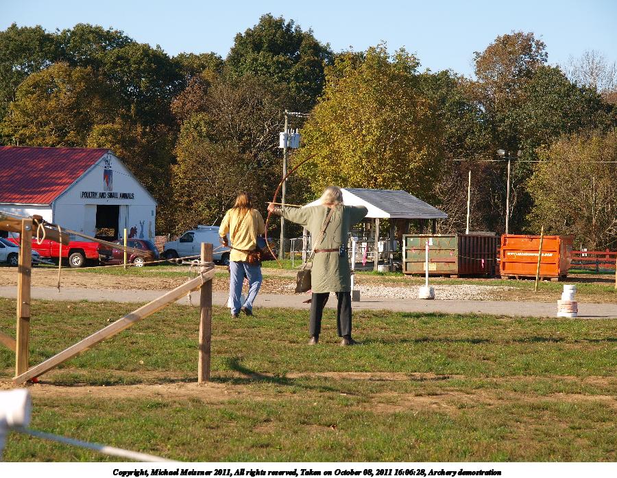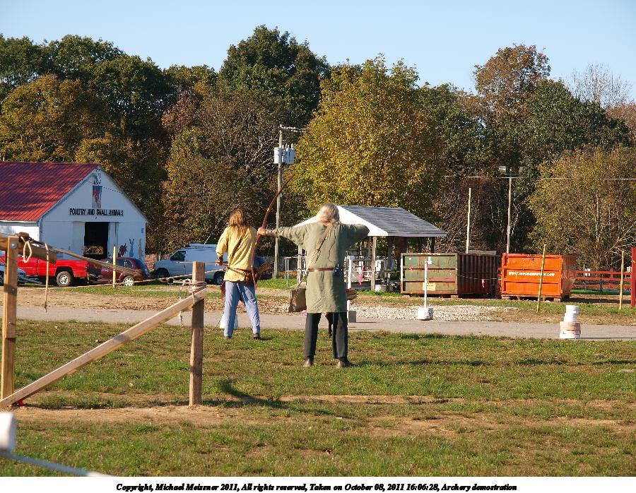 Picture #4: Archery demostration #4 Small: 900x698, 201,772 bytes (198K), (html file) Large: 3600x2700, 4,579,960 bytes (4.4M), (html file) Copyright, Michael Meissner 2011, All rights reserved Olympus E-3 camera with Olympus 14-54mm f/2.8-3.5 lens f/5.6, ISO 100, 1/320 sec, 54.0mm, auto mode, vivid color, SHQ, matrix metering, continous focus, IS1 (All Direction Shake IS), noise filter low 35mm equivalent focal length 108.0mm Programs used: raw therapee Taken by Michael Meissner on October 08, 2011 16:07:13 Last modified on January 29, 2012 at 18:55 |