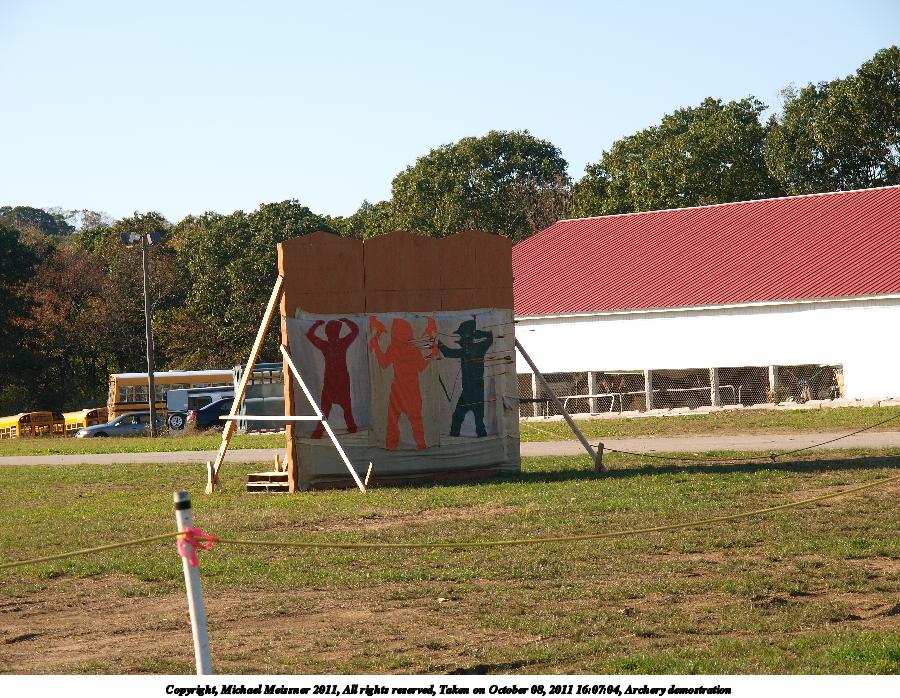 Picture #3: Archery demostration #3 Small: 900x698, 180,699 bytes (177K), (html file) Large: 3600x2700, 4,012,234 bytes (3.8M), (html file) Copyright, Michael Meissner 2011, All rights reserved Olympus E-3 camera with Olympus 14-54mm f/2.8-3.5 lens f/5.0, ISO 100, 1/250 sec, 54.0mm, auto mode, vivid color, SHQ, matrix metering, continous focus, IS1 (All Direction Shake IS), noise filter low 35mm equivalent focal length 108.0mm Programs used: raw therapee Taken by Michael Meissner on October 08, 2011 16:07:04 Last modified on January 29, 2012 at 18:54 |