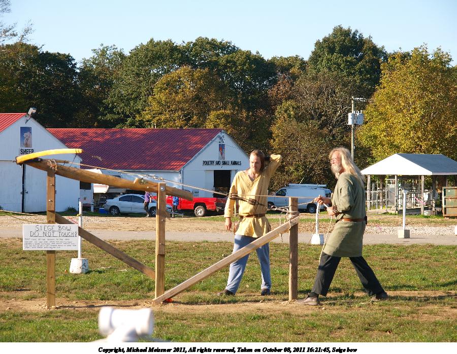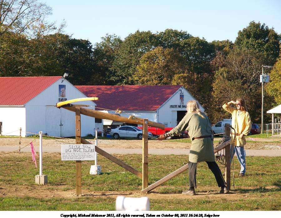 Picture #6: Seige bow #2 Small: 900x698, 204,511 bytes (200K), (html file) Large: 3600x2700, 4,342,629 bytes (4.1M), (html file) Copyright, Michael Meissner 2011, All rights reserved Olympus E-3 camera with Olympus 14-54mm f/2.8-3.5 lens f/5.0, ISO 100, 1/200 sec, 54.0mm, auto mode, vivid color, SHQ, matrix metering, continous focus, IS1 (All Direction Shake IS), noise filter low 35mm equivalent focal length 108.0mm Programs used: raw therapee Taken by Michael Meissner on October 08, 2011 16:24:28 Last modified on January 29, 2012 at 18:55 |