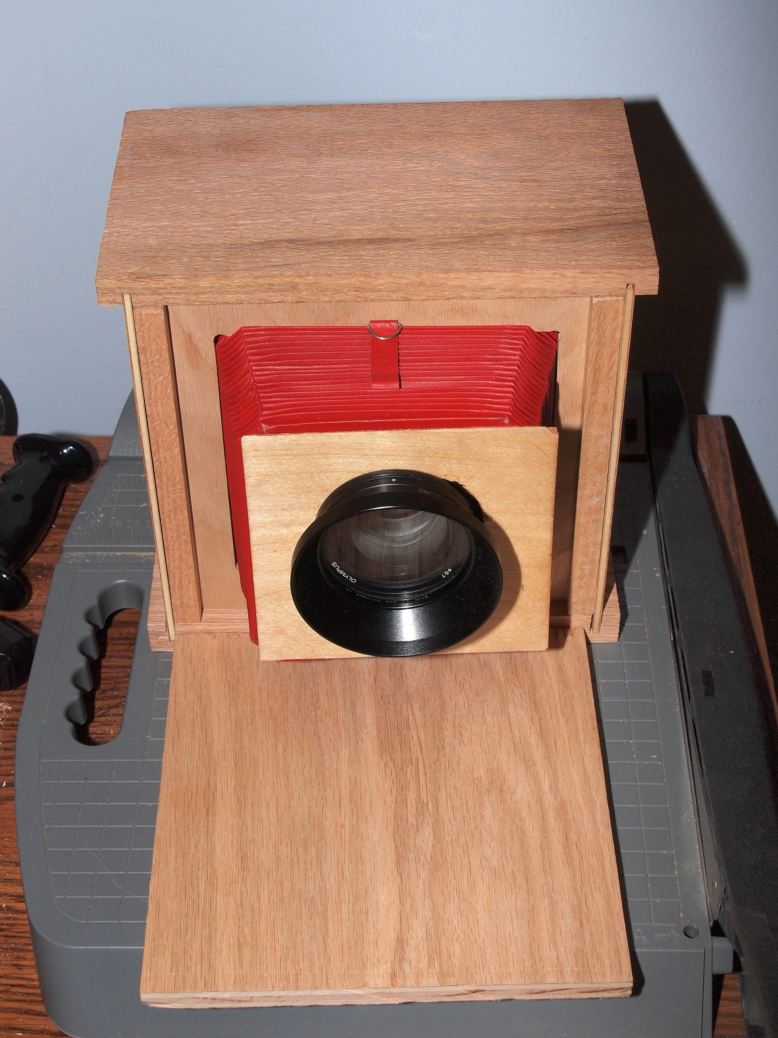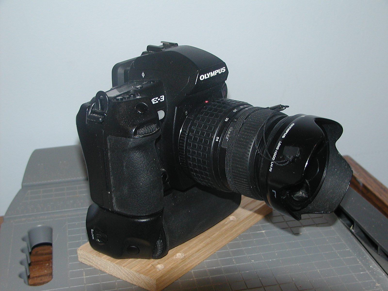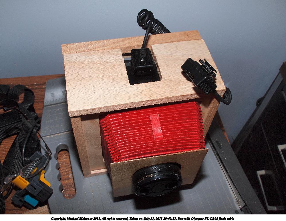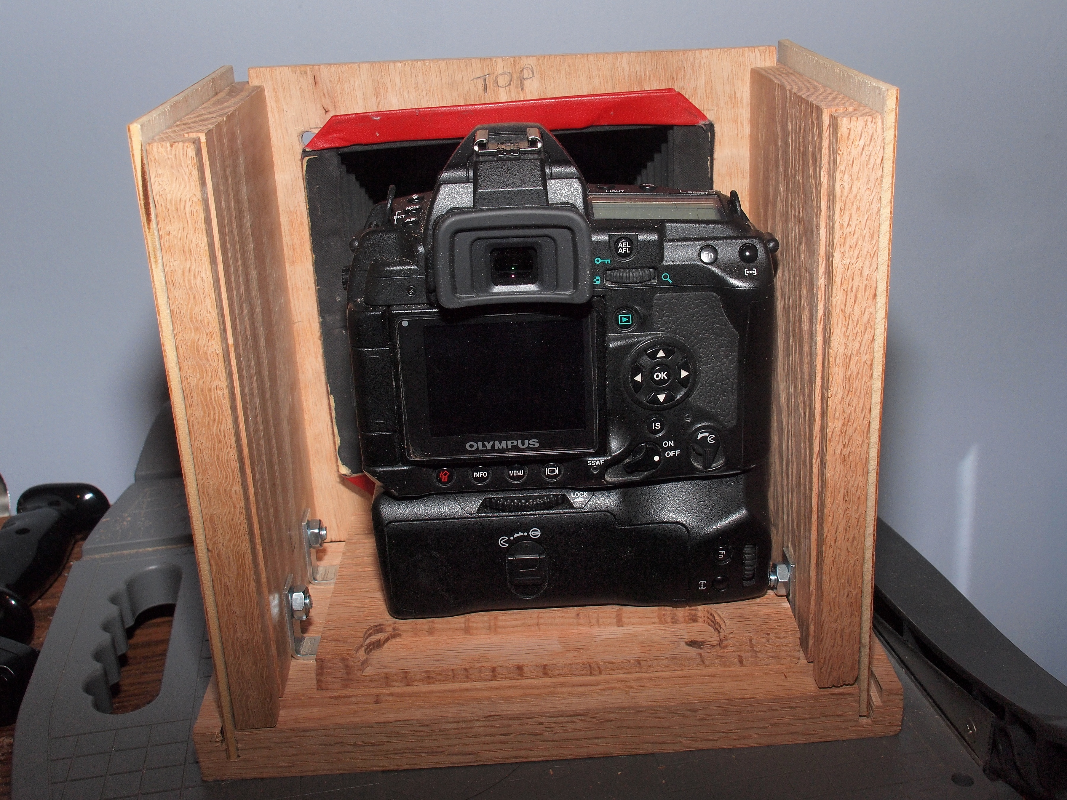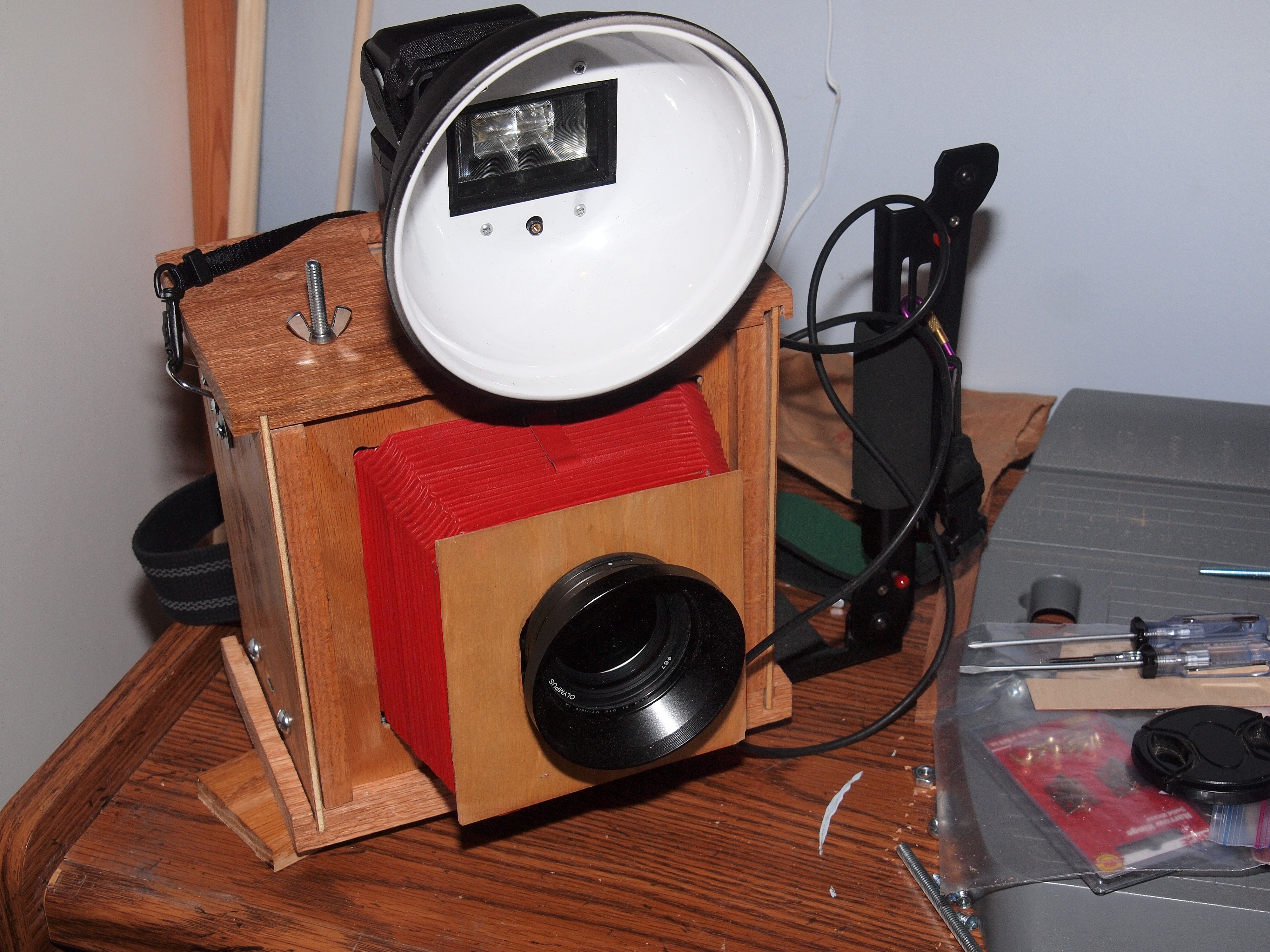 I still haven't decided on the ultimate way to connect the flash, so right now, I have a compromise approach. I have enough of the top cut out to support the pop-up flash, a flash cable (Olympus FL-CB05) or a FL-36 flash. My larger Metz 48 AF-1 flash won't fit in the openning, and I anticipate eventually having a different top for each flash option.