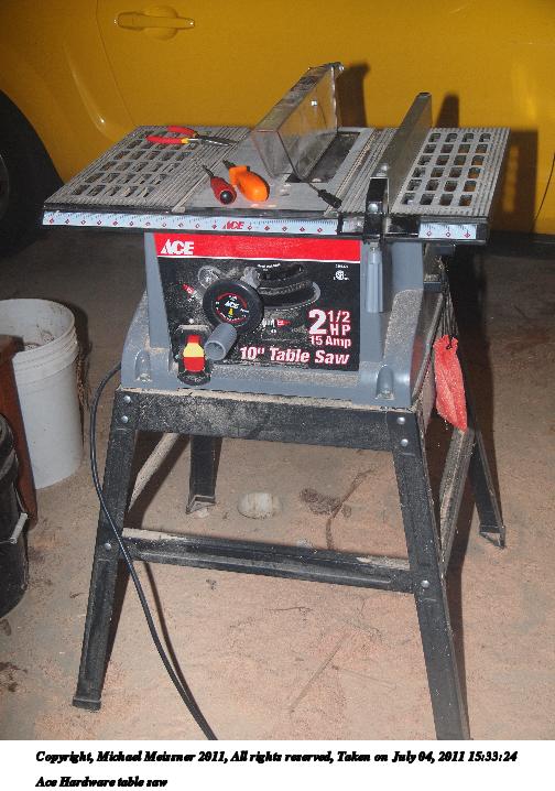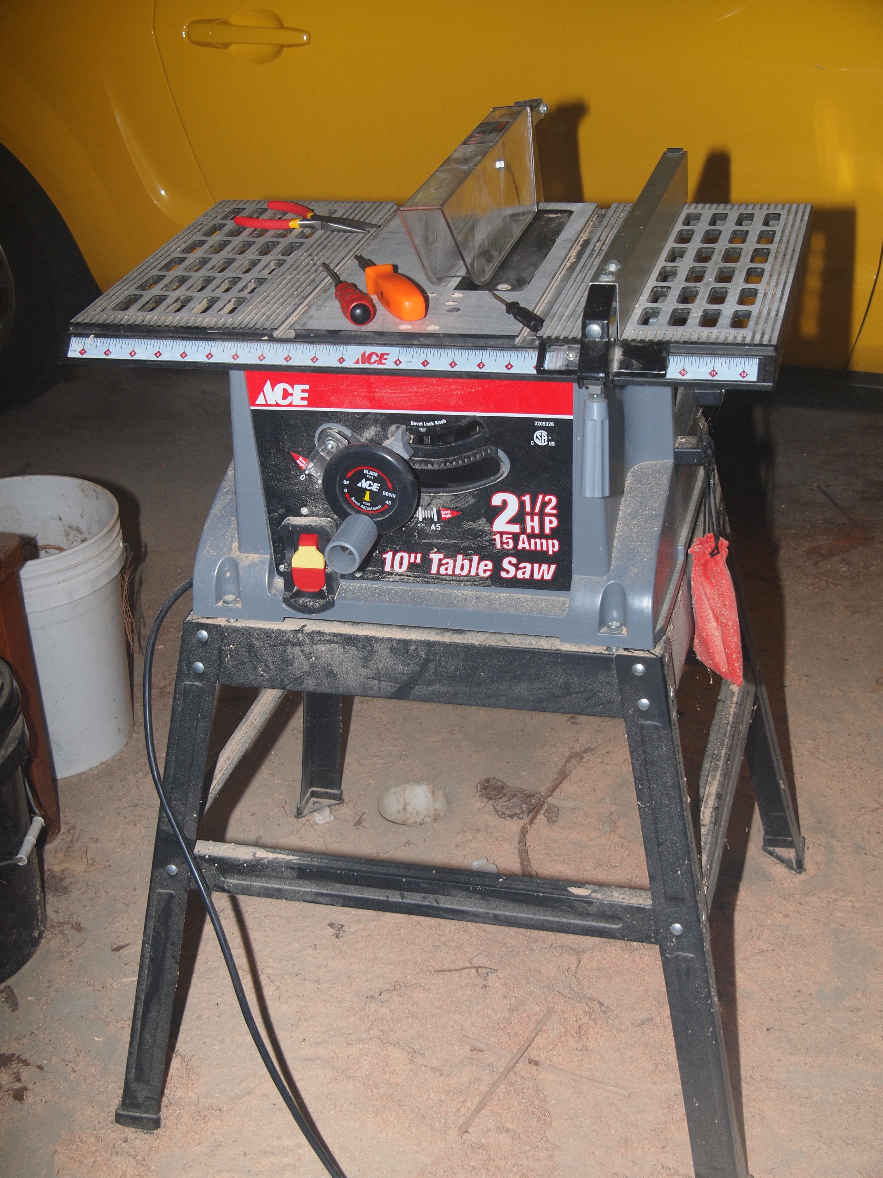 Picture #73: Ace Hardware table saw Small: 504x718, 83,757 bytes (82K), (html file) Large: 3024x4032, 7,685,627 bytes (7.3M), (html file) Copyright, Michael Meissner 2011, All rights reserved Olympus E-P2 camera with Olympus-m43 14-150mm f/4.0-5.6 lens f/4.7, ISO 200, FL-36 flash (+0.33 flash compensation), 1/60 sec, 25.0mm, auto mode, vivid color, SHQ, matrix metering, auto + manual focus, IS1 (All Direction Shake IS) 35mm equivalent focal length 50.0mm Extra equipment used: Olympus FL-36 flash Taken by Michael Meissner on July 04, 2011 15:33:24 Last modified on July 04, 2011 at 23:33 I bought the table saw to cut wood to shape, and also make 45 degree beveled cuts. |