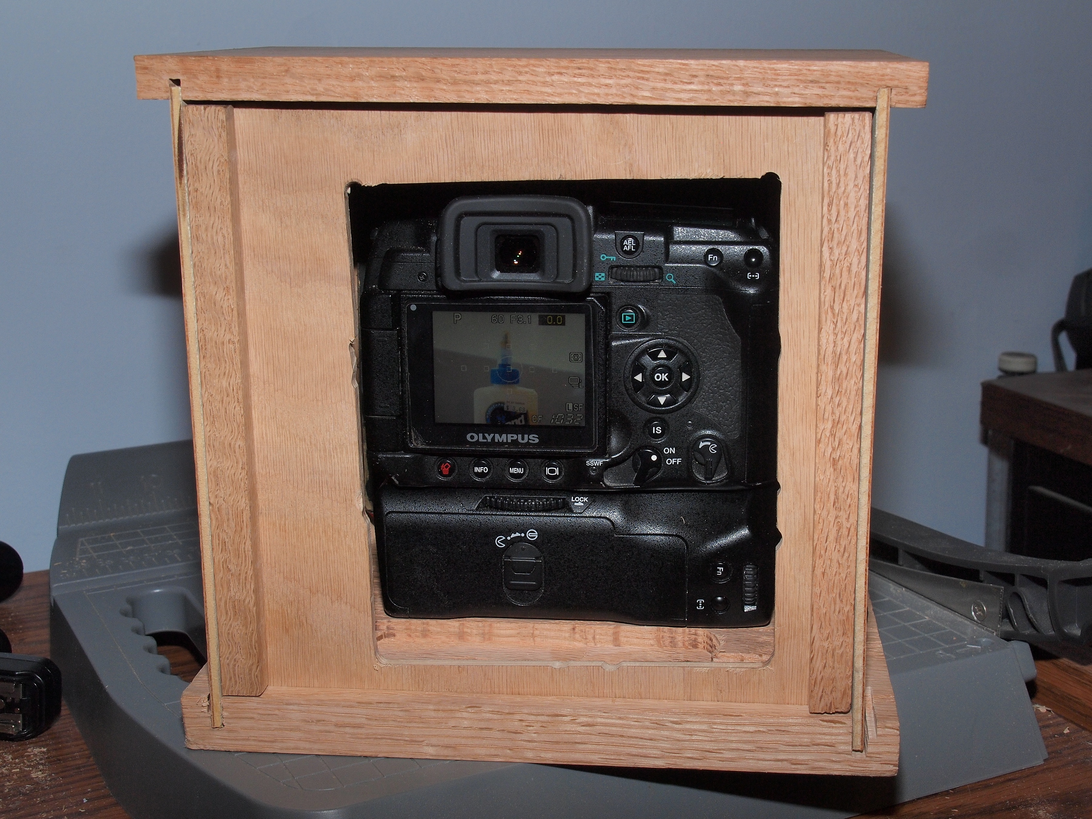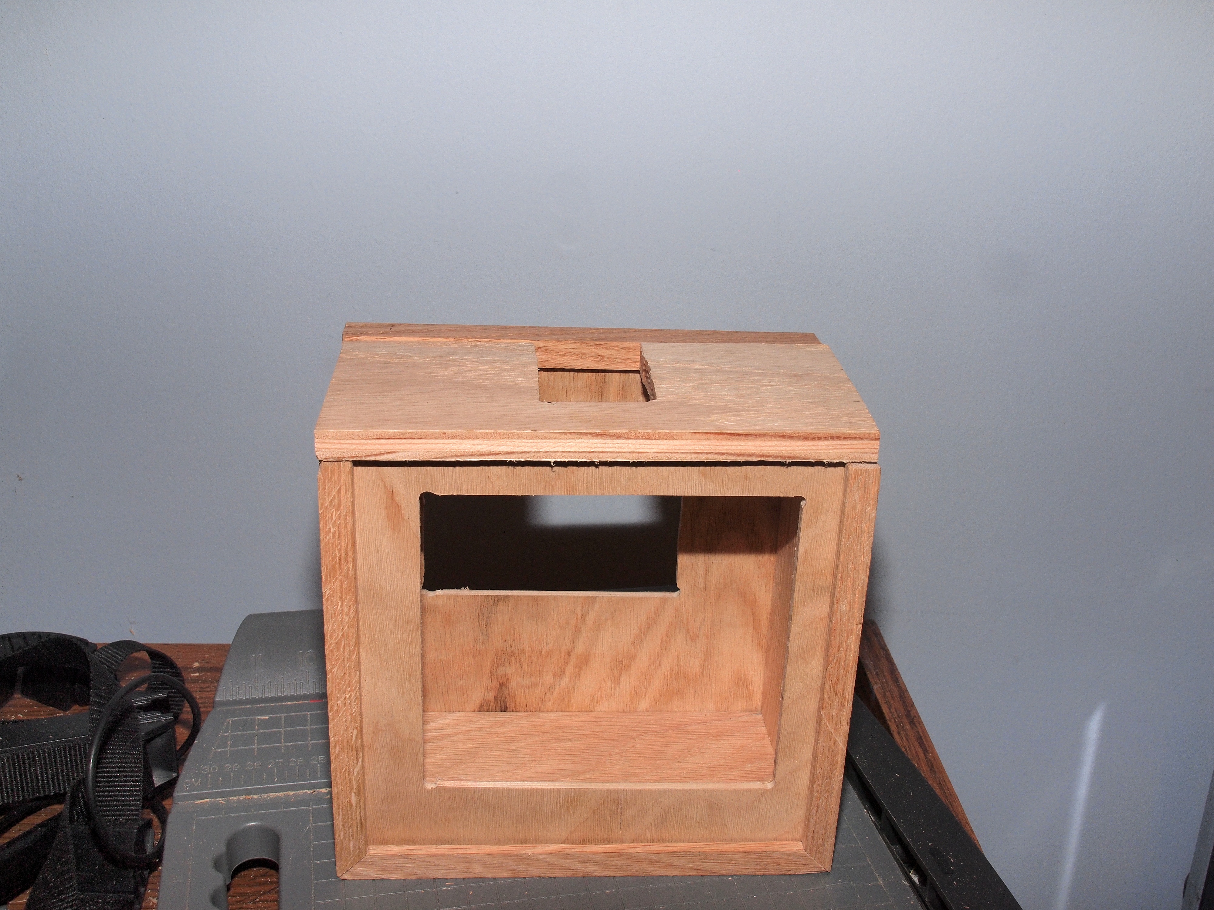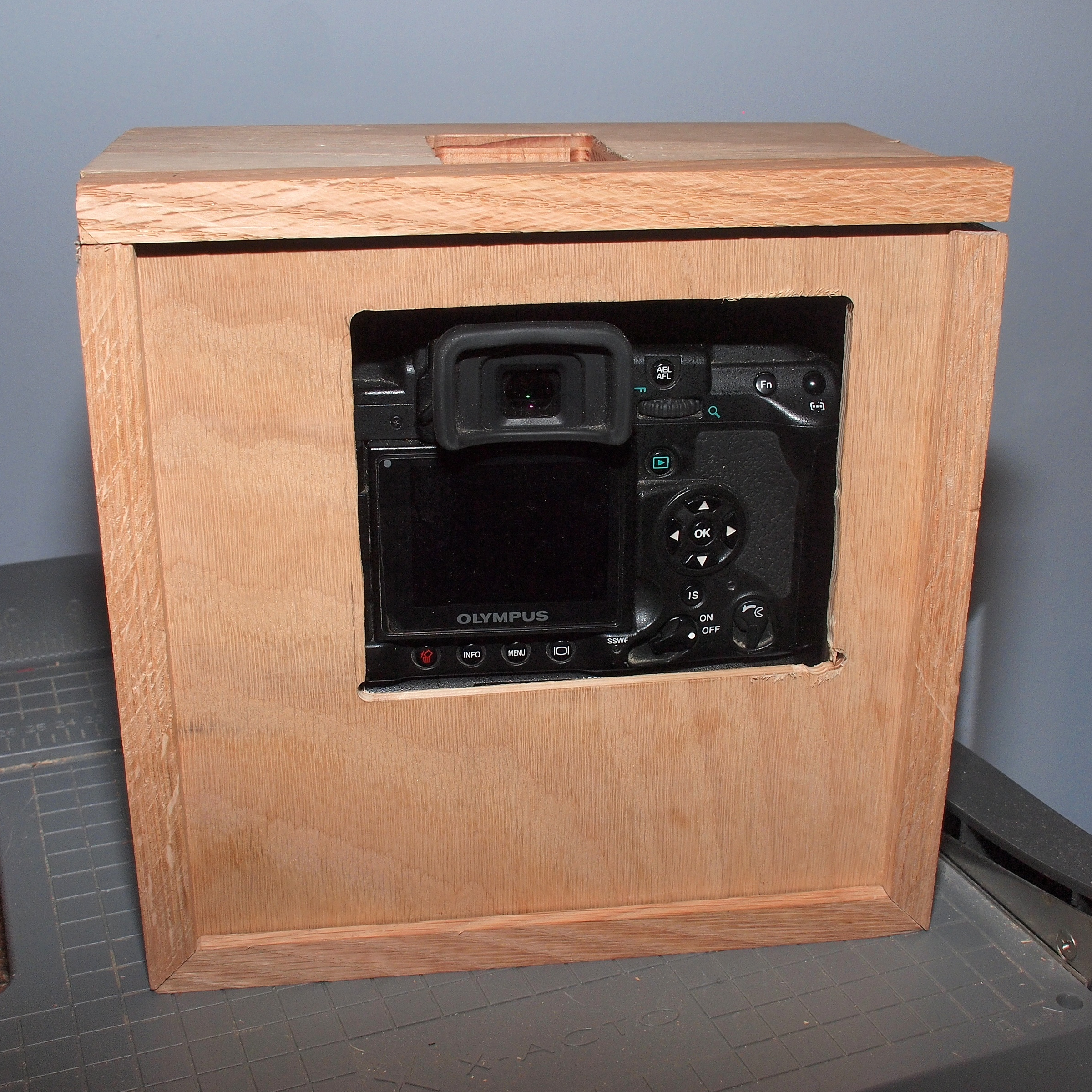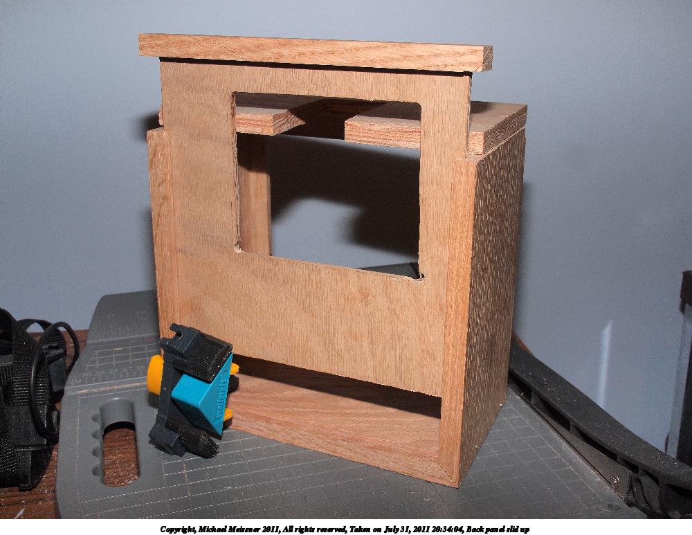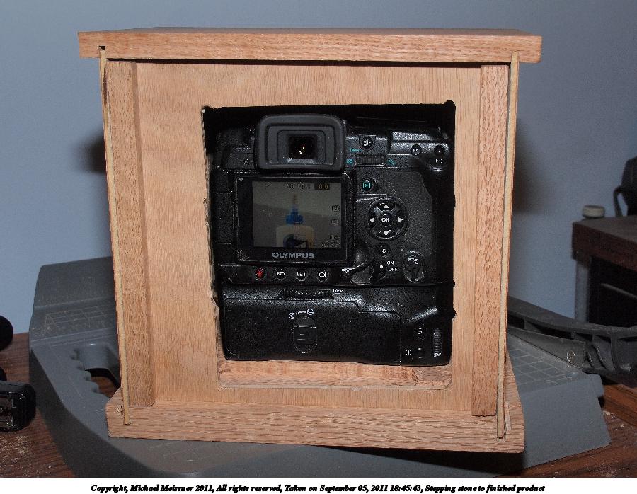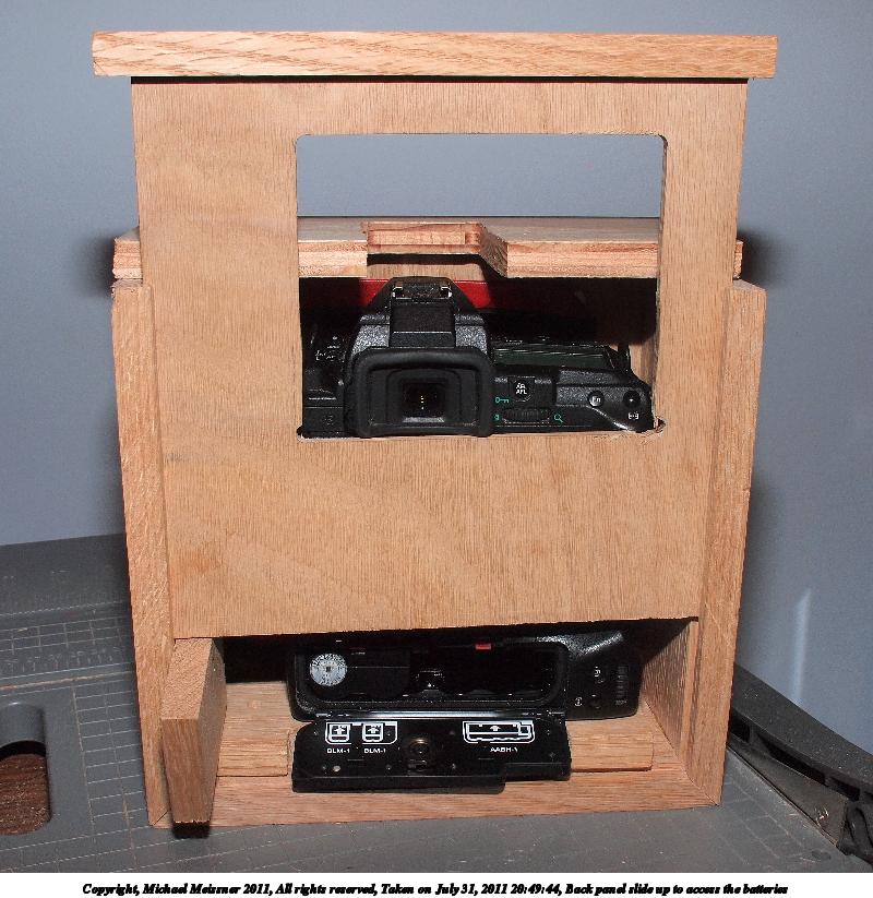 Originally, I was going use 45 degree bevel cuts for each of the four sides. However, in this generation, I've had problems getting all four corners exactly level, so for now, I just sliced off the angle joints and will mount the top as a flat piece of wood. In order to remove the front panel, you need to remove the top, but I made the back panel separate, so that you can slide up the back panel to remove the camera or change batteries. You can slide up the panel just a bit to get access to the HLD-4to change batteries.