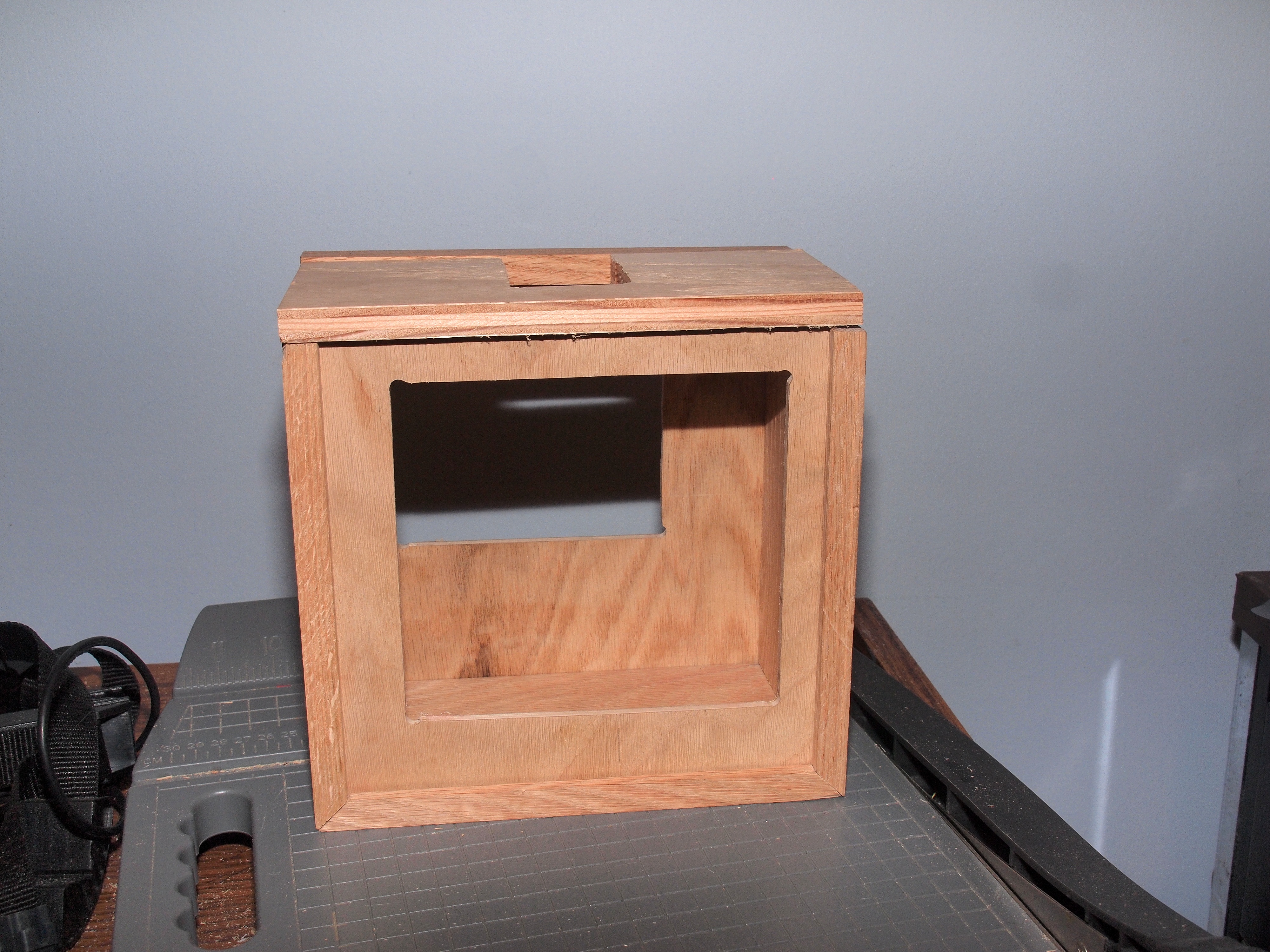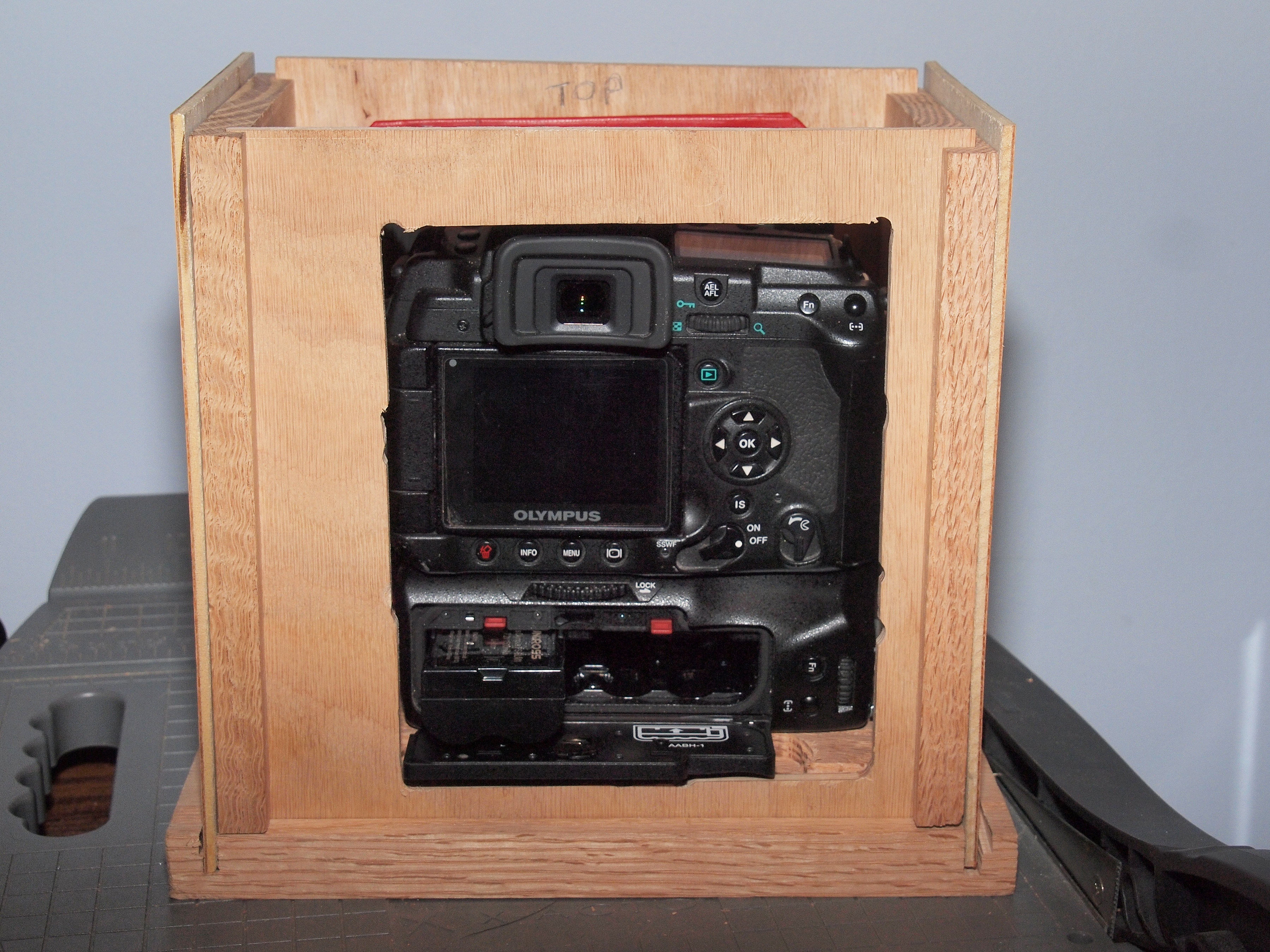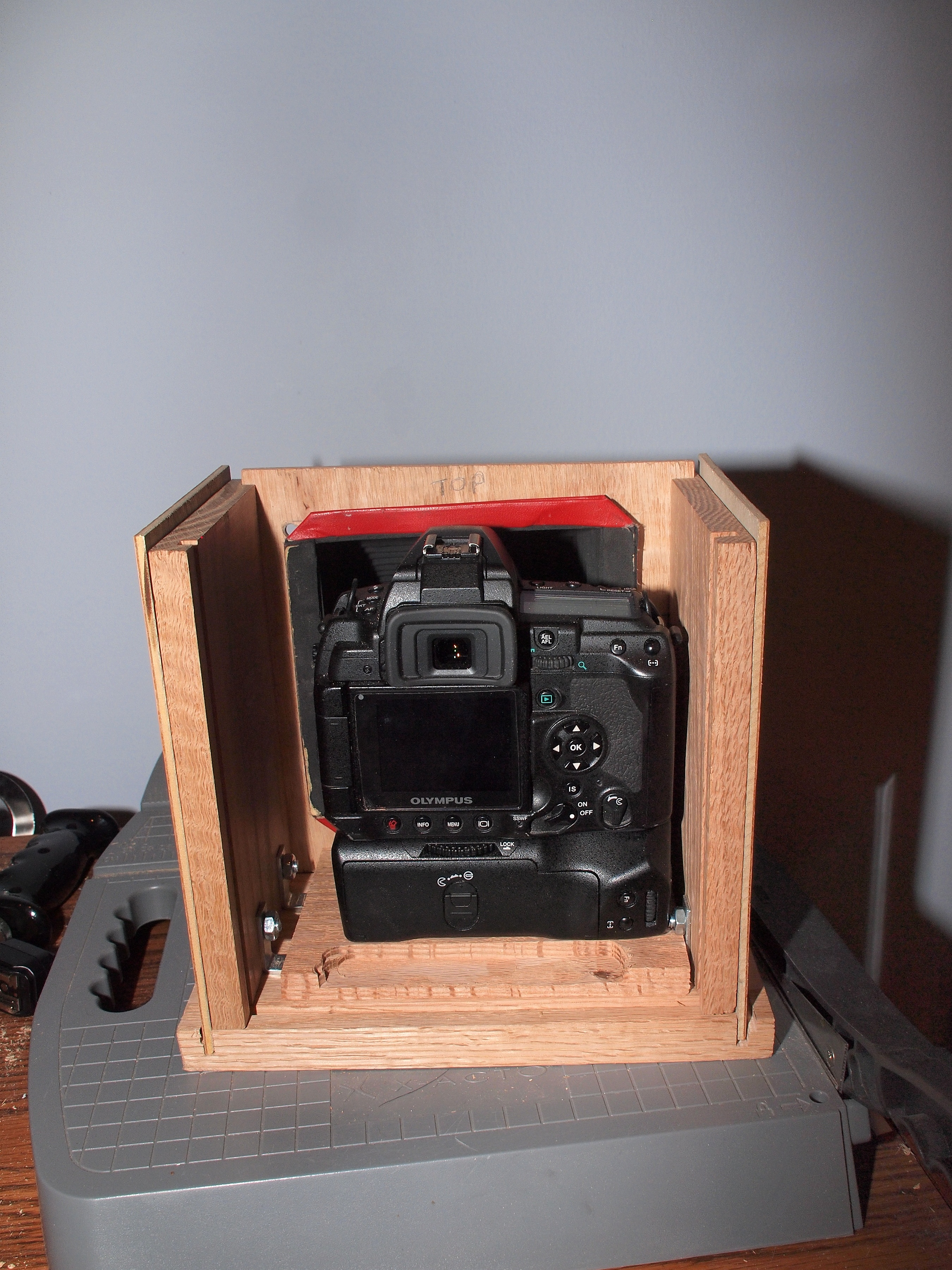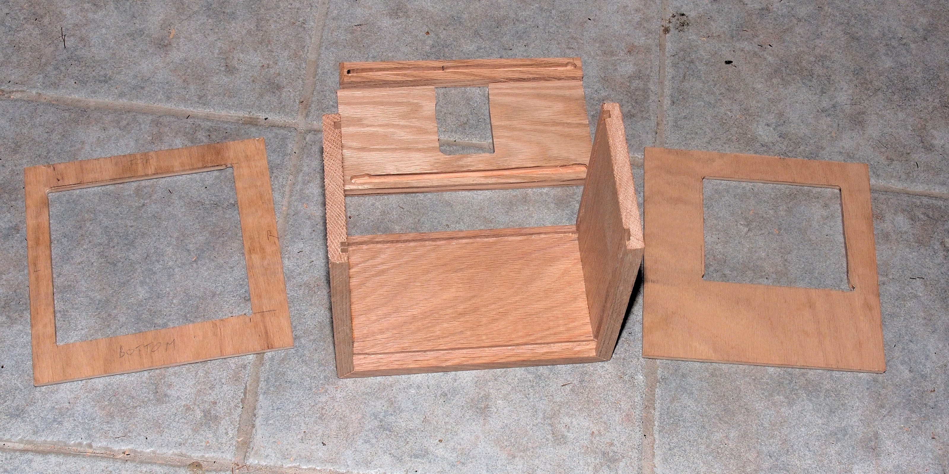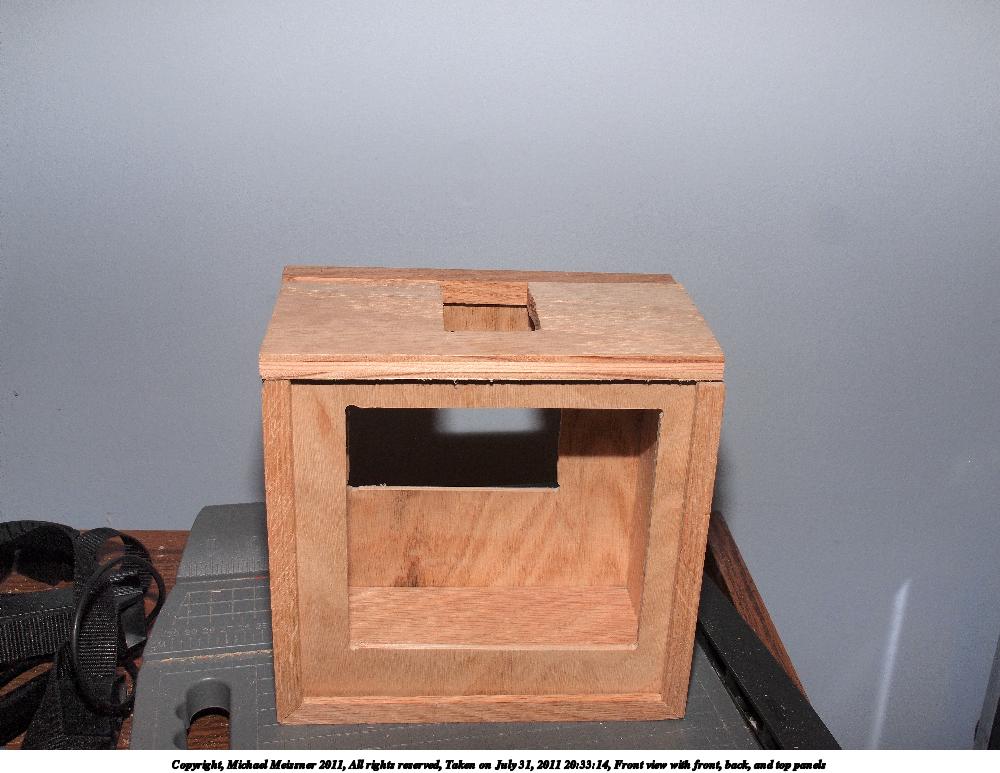 Originally, I was going use 45 degree bevel cuts for each of the four sides. However, in this generation, I've had problems getting all four corners exactly level, so for now, I just sliced off the angle joints and will mount the top as a flat piece of wood. In order to remove the front panel, you need to remove the top, but I made the back panel separate, so that you can slide up the back panel to remove the camera or change batteries. You can slide up the panel just a bit to get access to the HLD-4to change batteries.