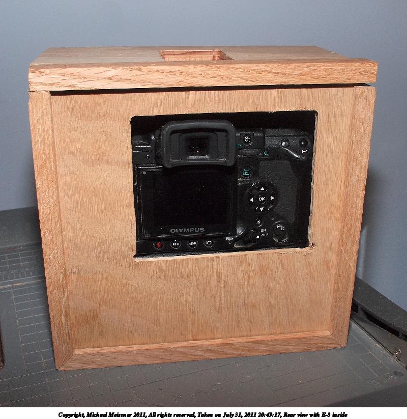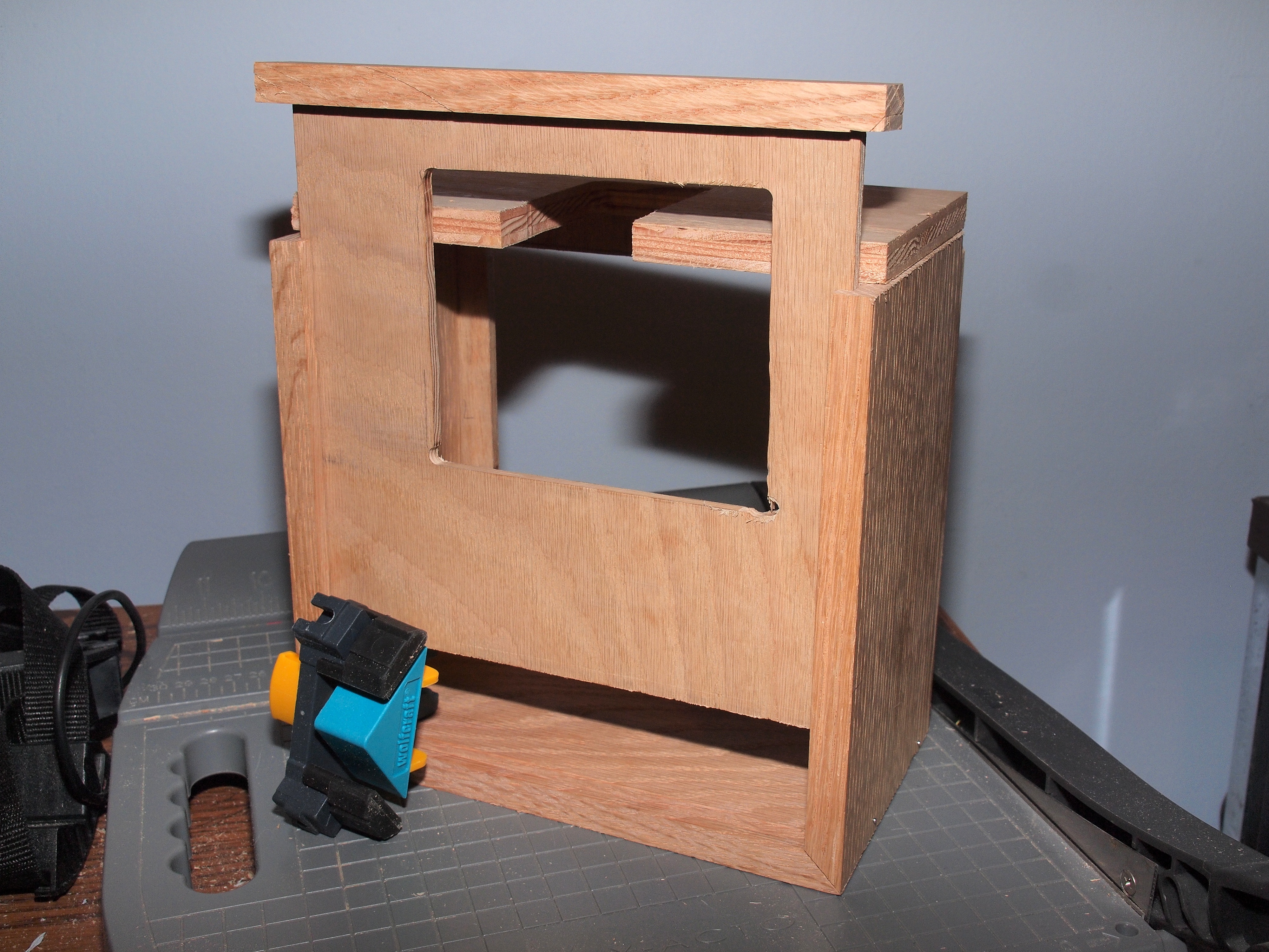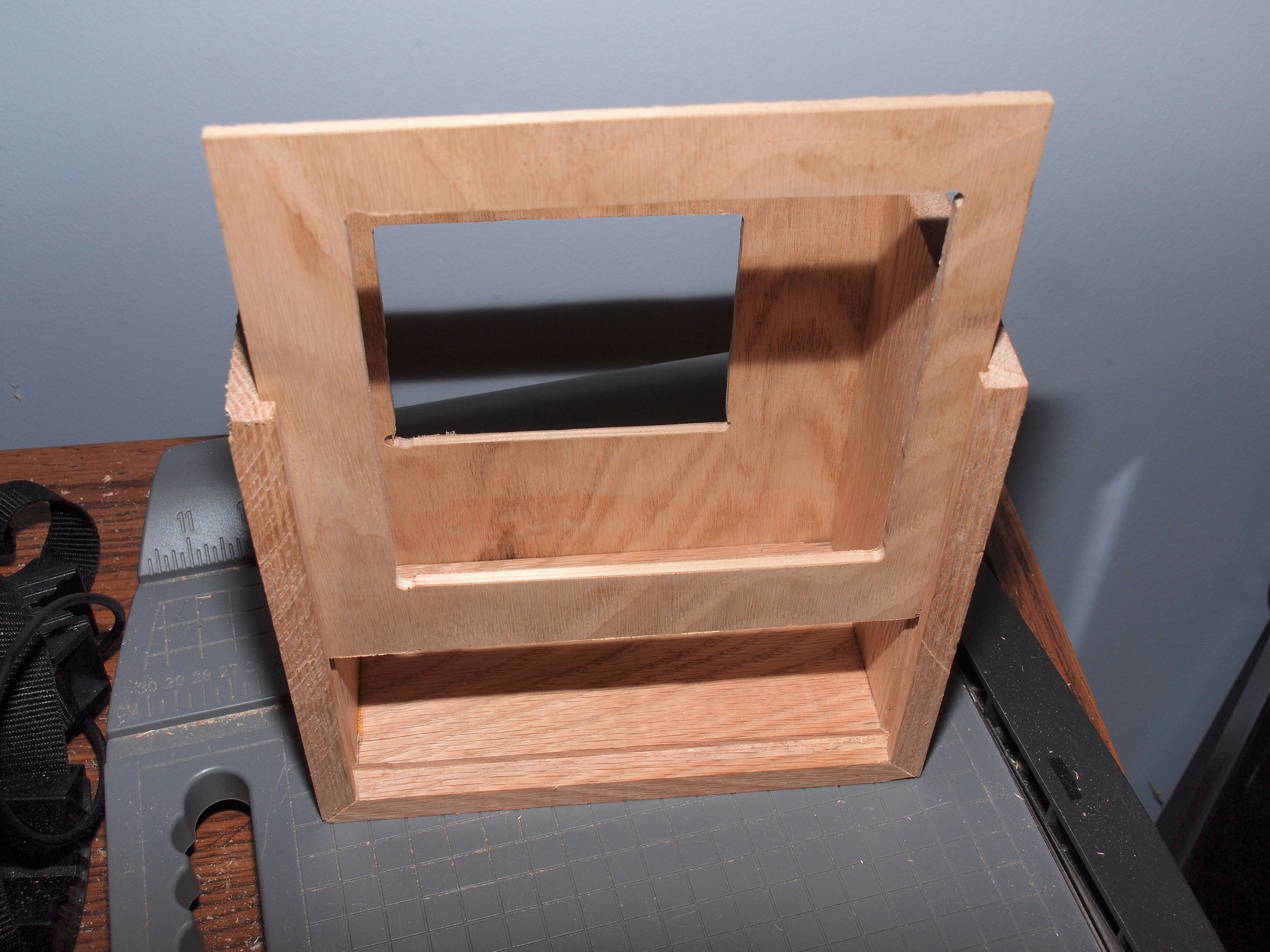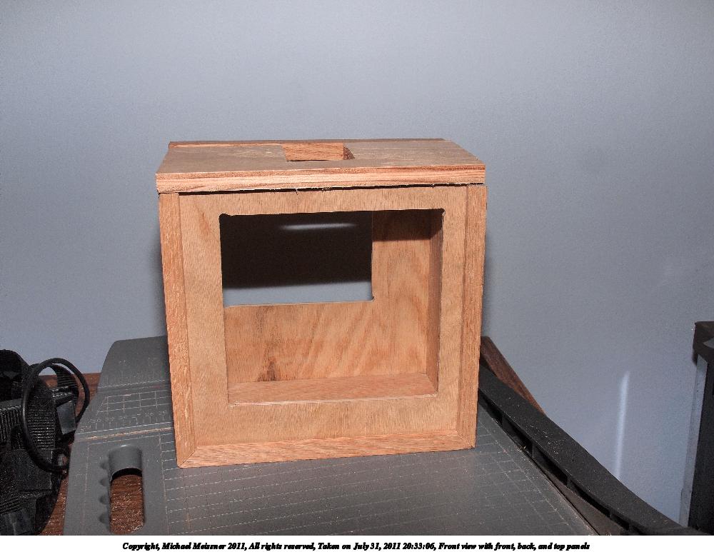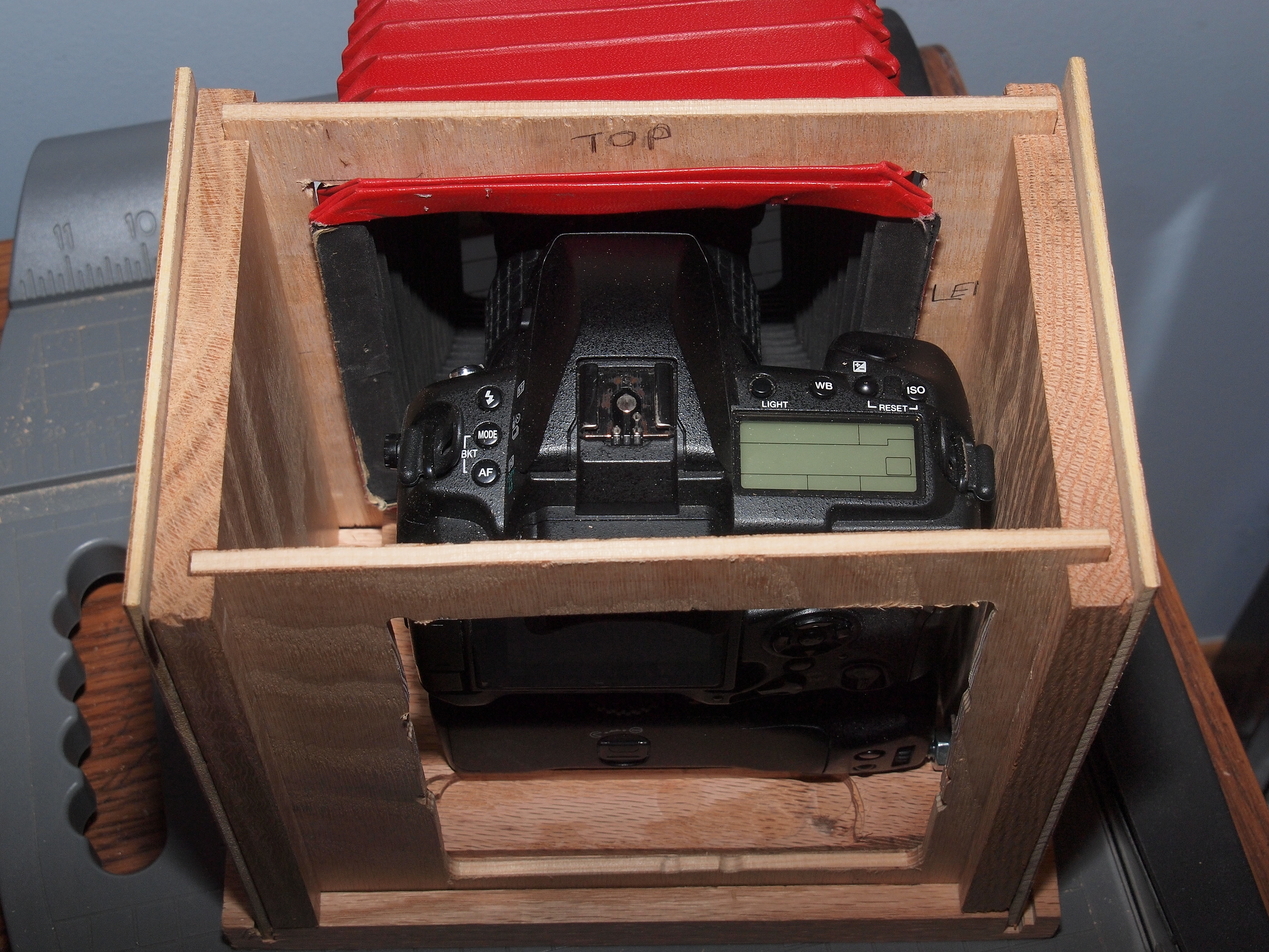 Originally, I was going use 45 degree bevel cuts for each of the four sides. However, in this generation, I've had problems getting all four corners exactly level, so for now, I just sliced off the angle joints and will mount the top as a flat piece of wood. In order to remove the front panel, you need to remove the top, but I made the back panel separate, so that you can slide up the back panel to remove the camera or change batteries. You can slide up the panel just a bit to get access to the HLD-4to change batteries.