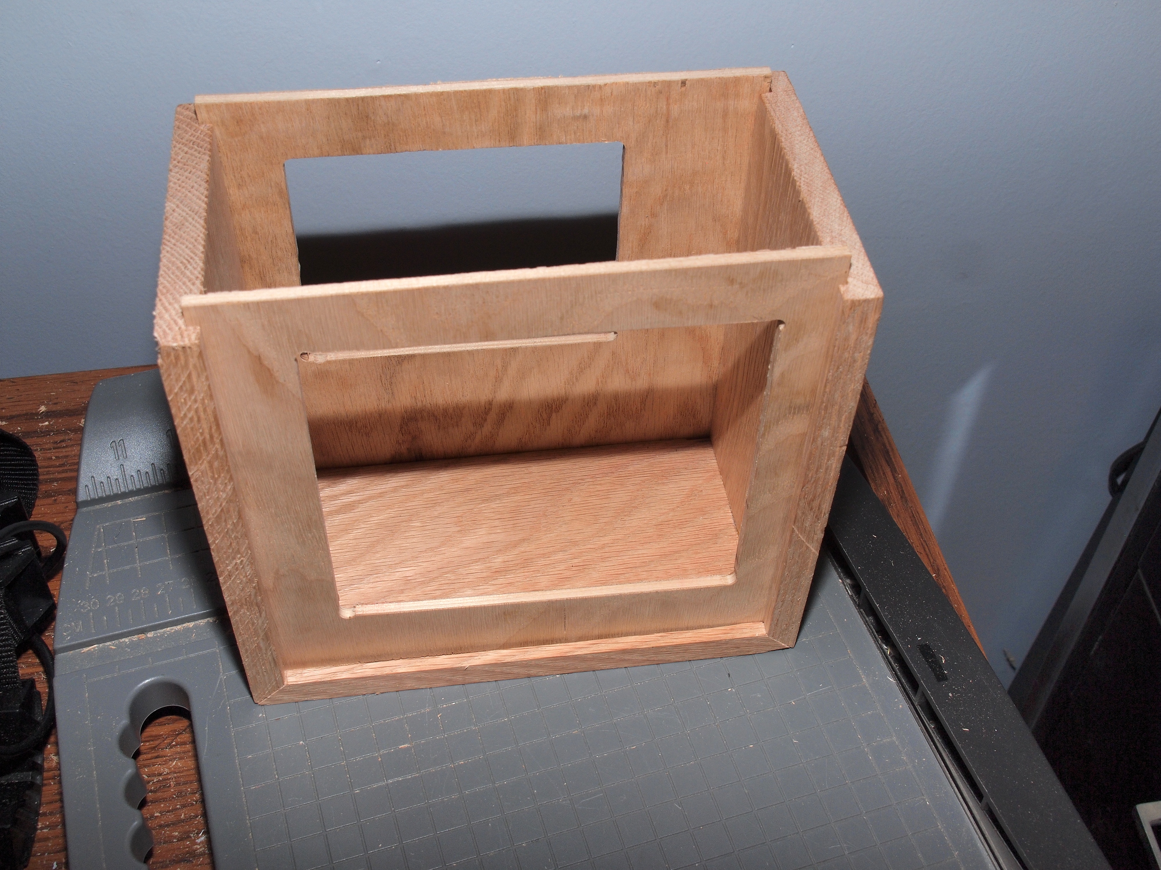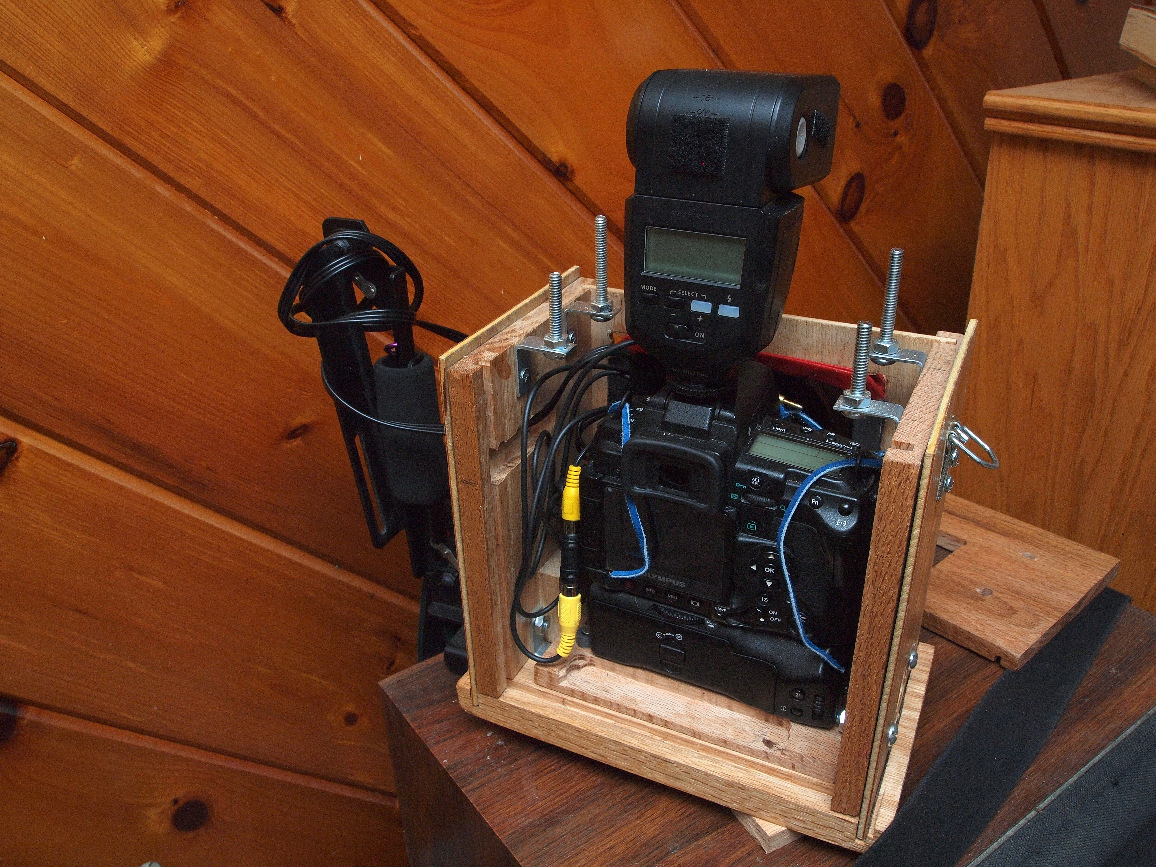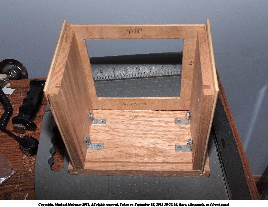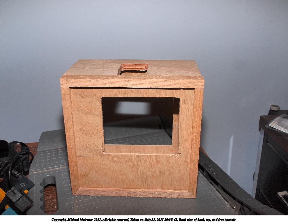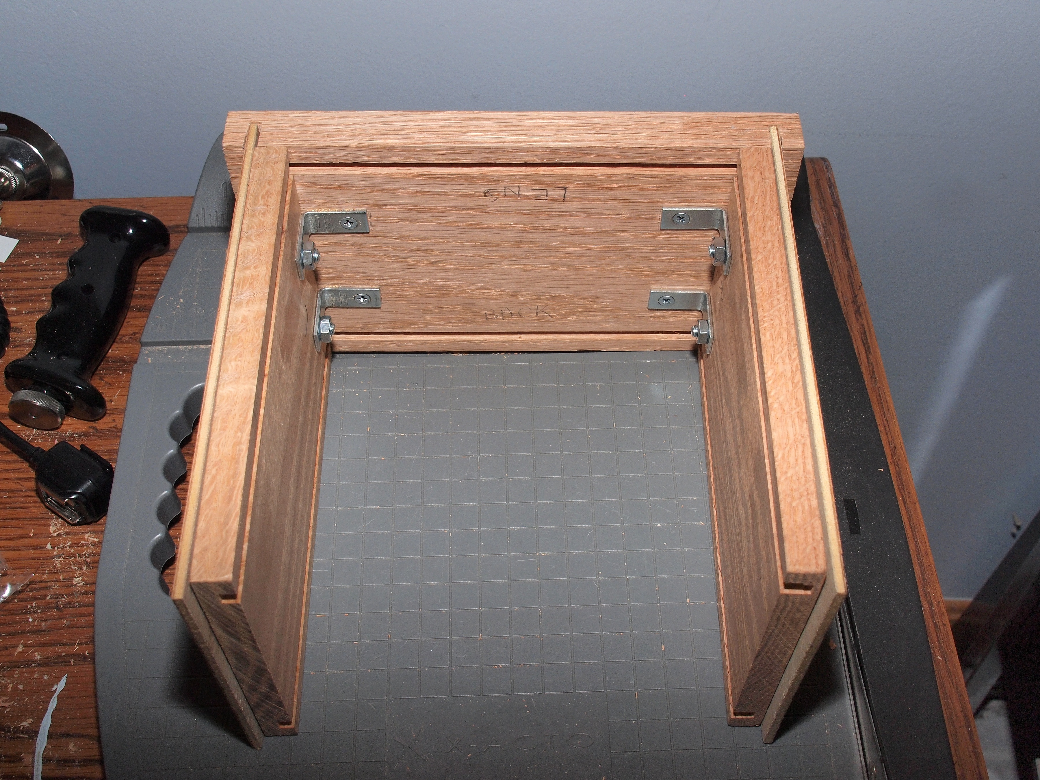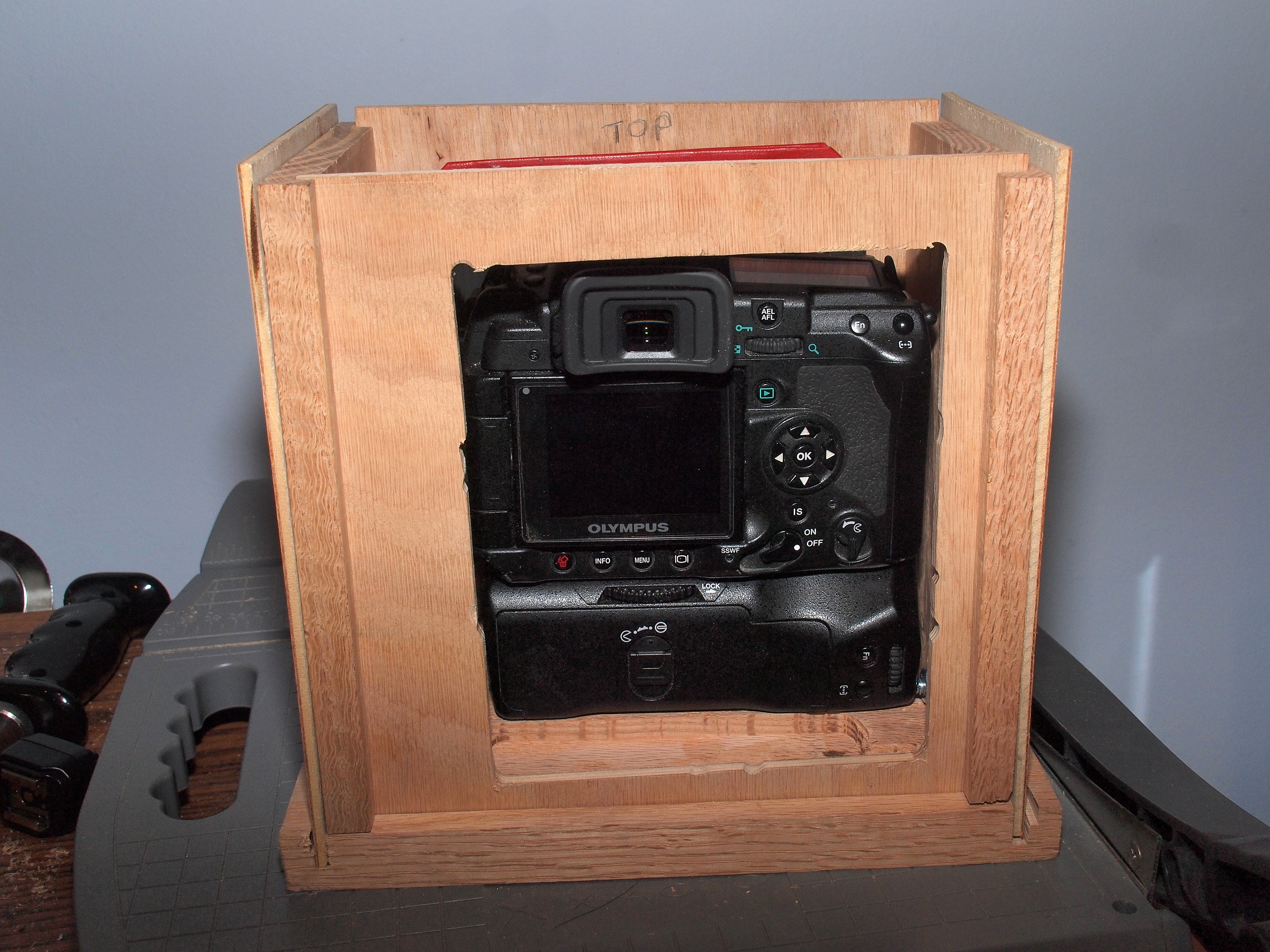 Originally, I was going use 45 degree bevel cuts for each of the four sides. However, in this generation, I've had problems getting all four corners exactly level, so for now, I just sliced off the angle joints and will mount the top as a flat piece of wood. In order to remove the front panel, you need to remove the top, but I made the back panel separate, so that you can slide up the back panel to remove the camera or change batteries. You can slide up the panel just a bit to get access to the HLD-4to change batteries.