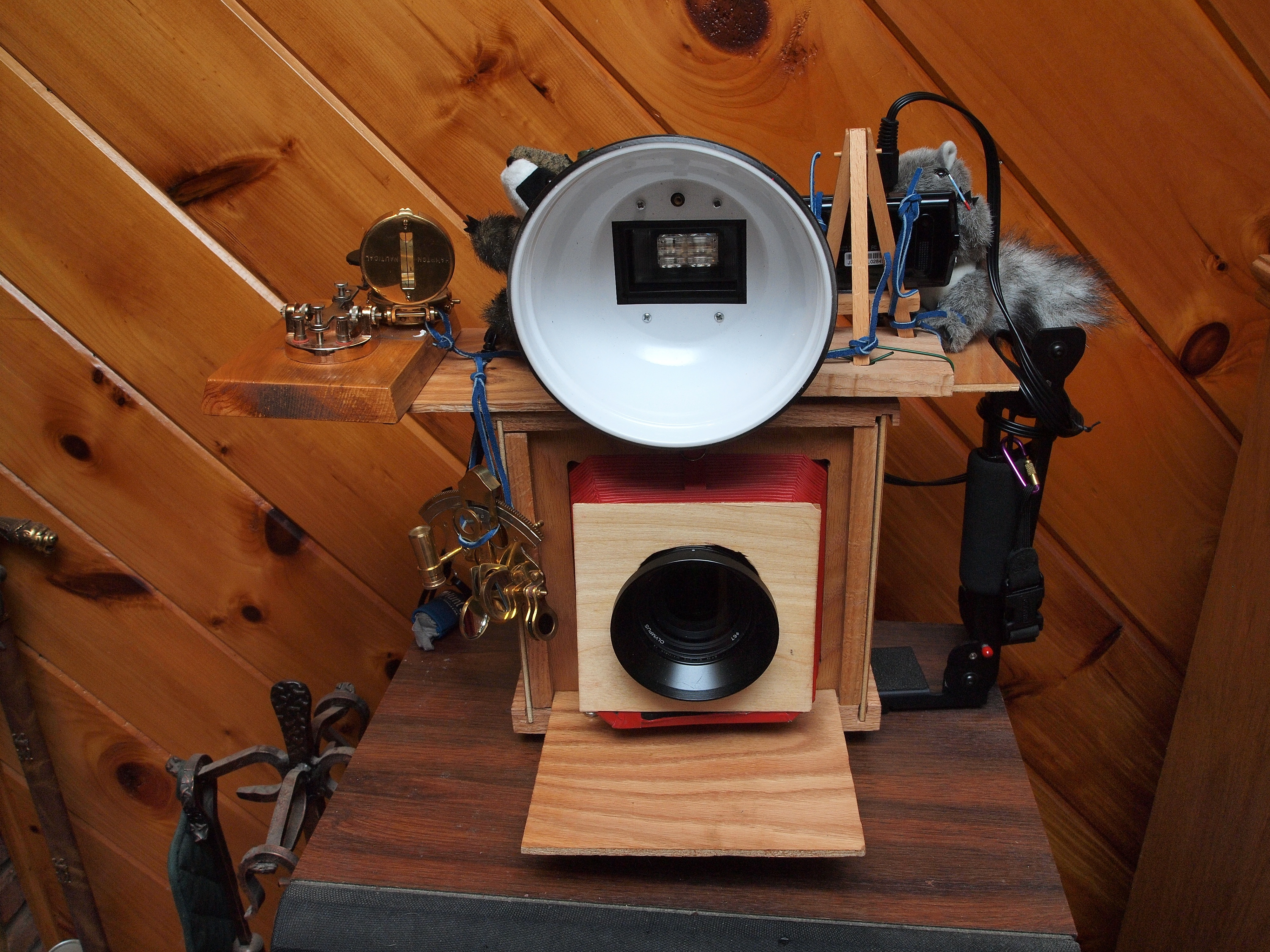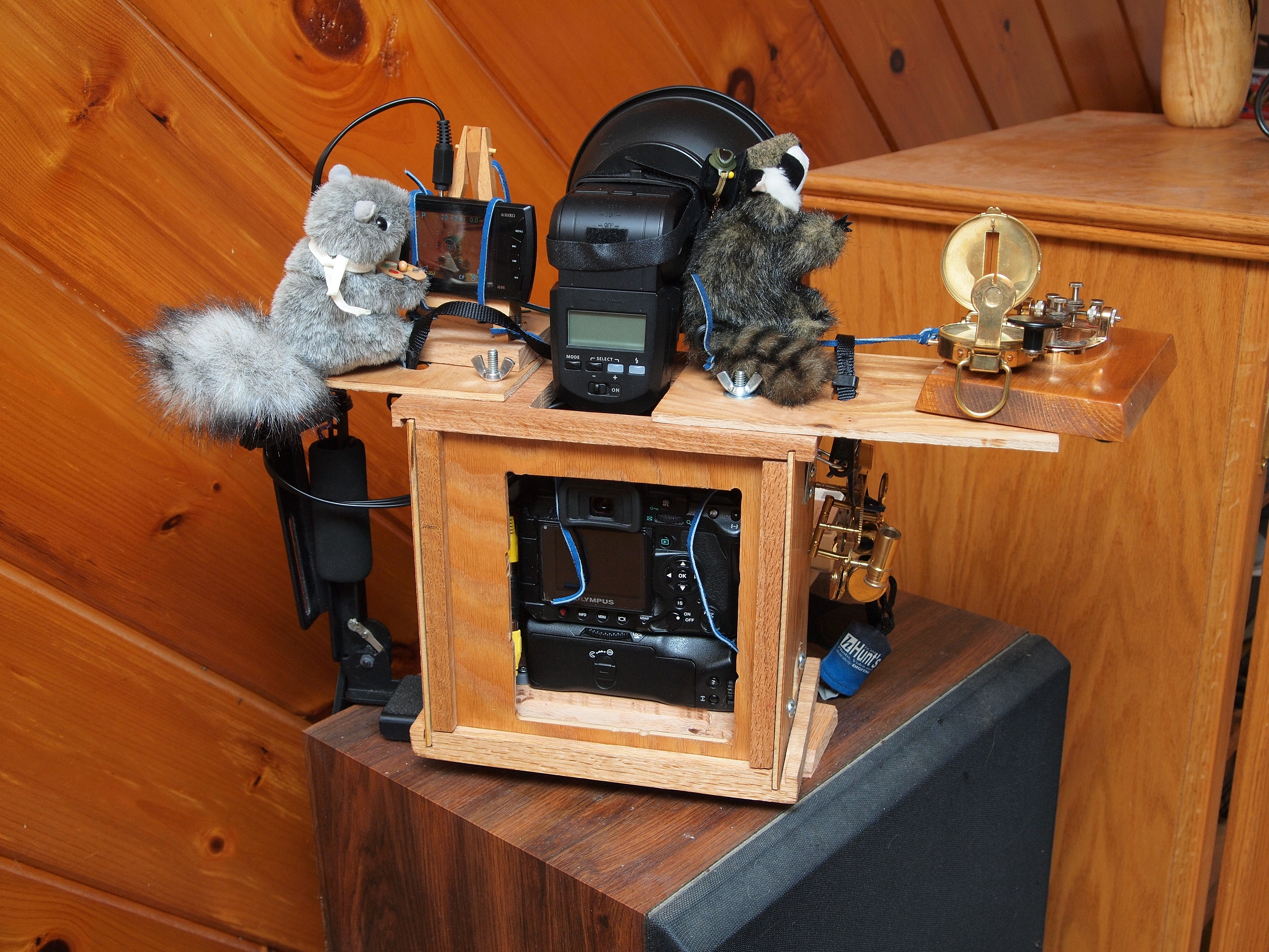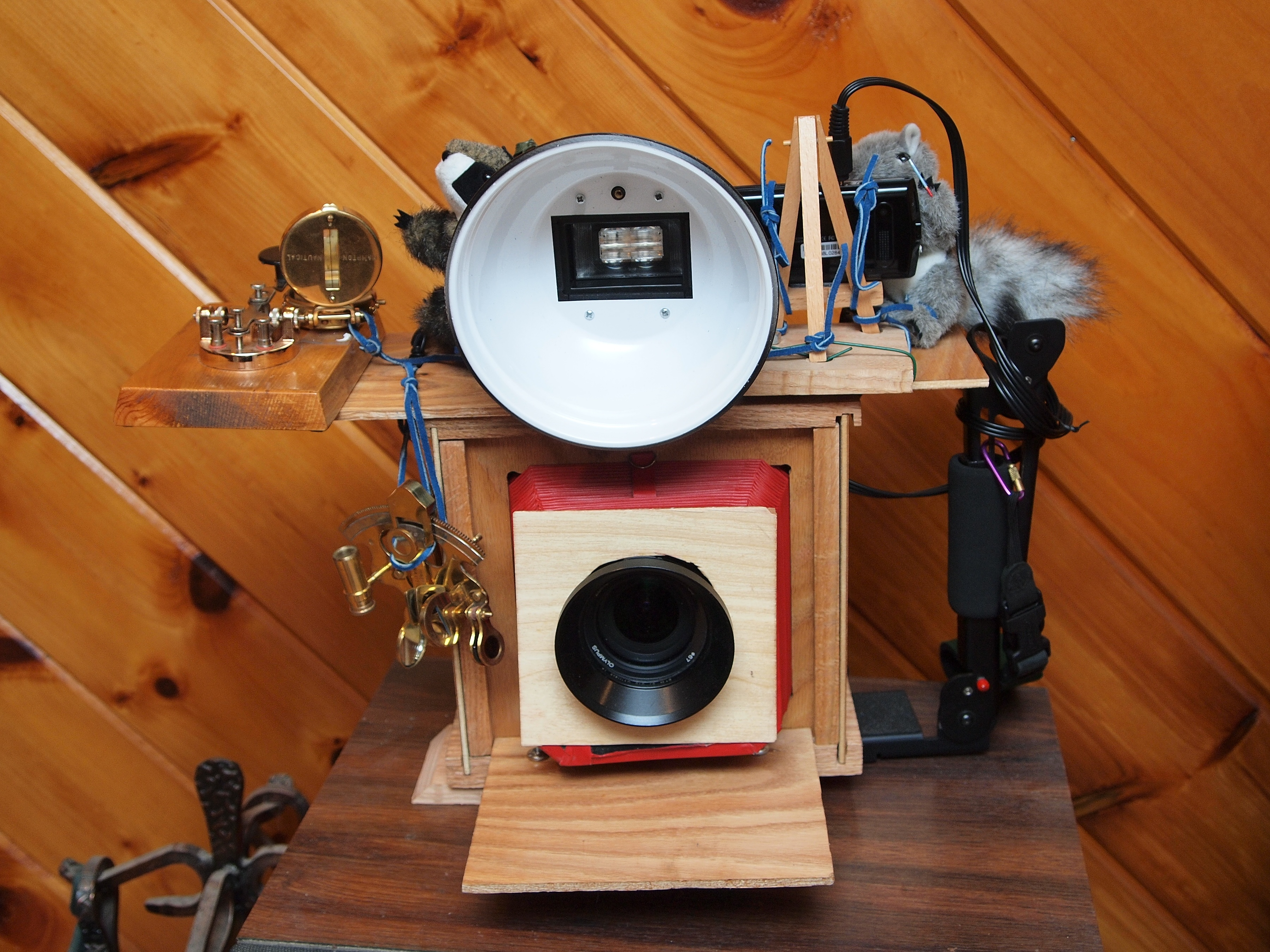 In the previous generation of the box, I attached the camera via the tripod screw to the box via a screw that went through the box. It usually took several minutes to line up the camera to the screw hole and attach the screw. Usually I would need to tip the box over on its side to line things up properly. This generation features a wooden base that the camera is mounted on that has a recessed screw to attach the camera to the base. This way, I will be able to attach the camera to the base, and just slide it in.