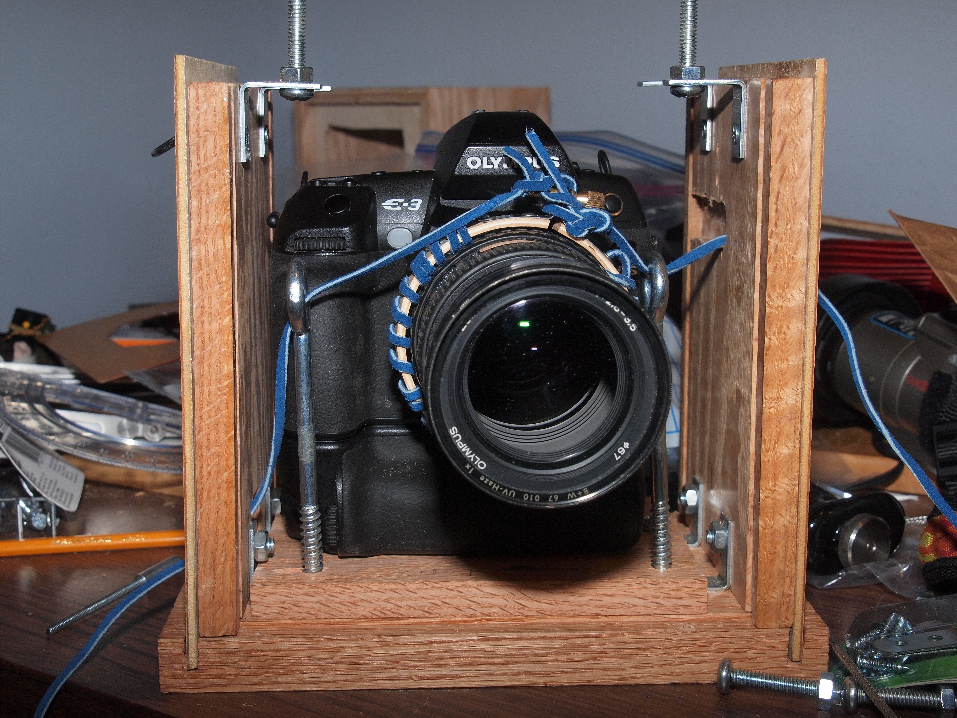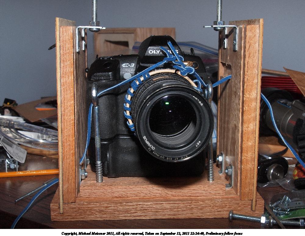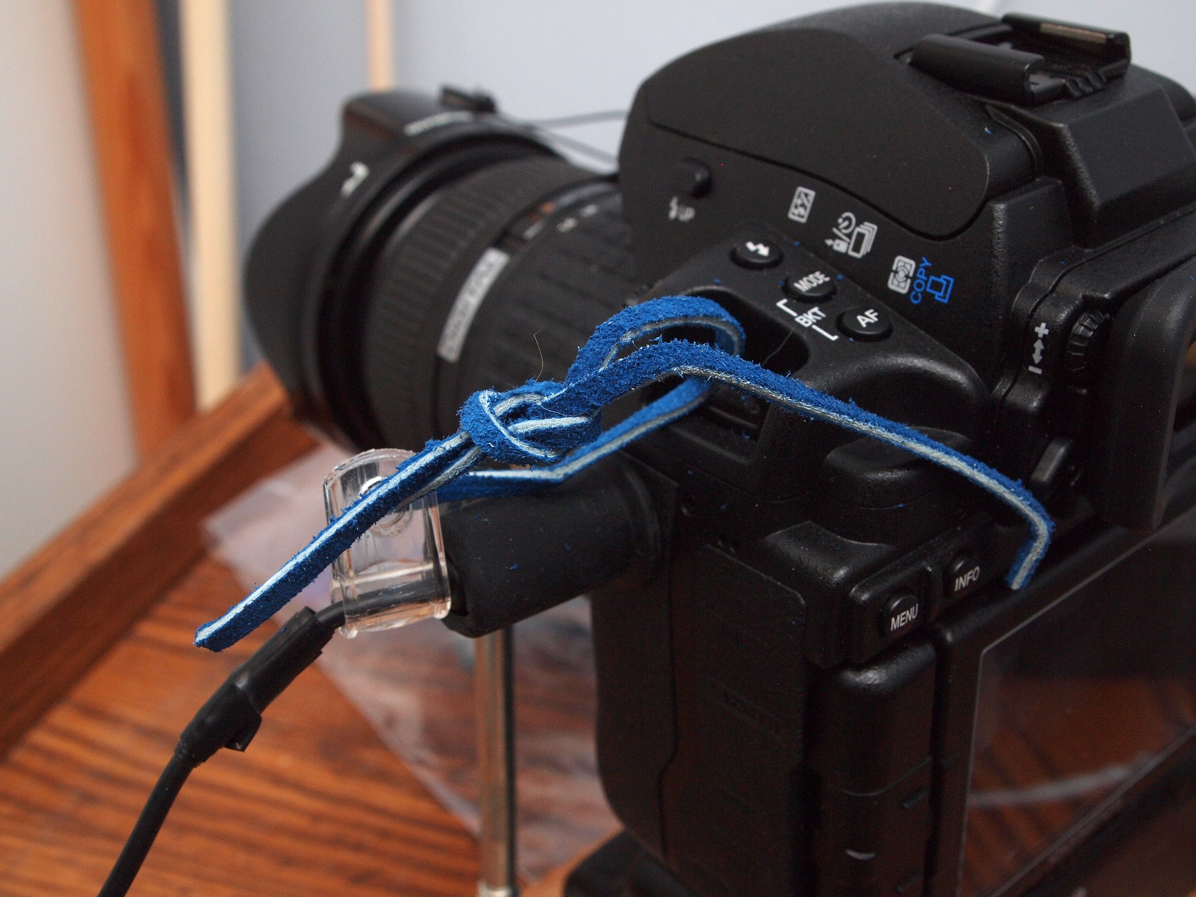 Picture #62: Preliminary follow focus Small: 1000x773, 166,022 bytes (163K), (html file) Large: 4000x3000, 4,475,107 bytes (4.3M), (html file) Copyright, Michael Meissner 2011, All rights reserved Olympus E-P2 camera with Olympus-m43 14-150mm f/4.0-5.6 lens f/8.0, ISO 200, FL-36 flash (+0.33 flash compensation), 1/60 sec, 25.0mm, aperture priority, vivid color, auto gradation, SHQ, matrix metering, auto + manual focus, IS1 (All Direction Shake IS), noise reduction auto, noise filter low 35mm equivalent focal length 50.0mm Extra equipment used: Olympus FL-36 flash Programs used: raw therapee Taken by Michael Meissner on September 12, 2011 22:24:40 Last modified on September 12, 2011 at 23:40 A follow focus is used on video camera to allow the operator to change the focus manually in a smooth fashion. I'm using a similar setup on the zoom ring so that I can control the zoom. The follow focus is made with a small embroidery hoop, wrapped in leather so it just fits over the 14-54mm lens, and two leather traps that when pulled will zoom the lens. |