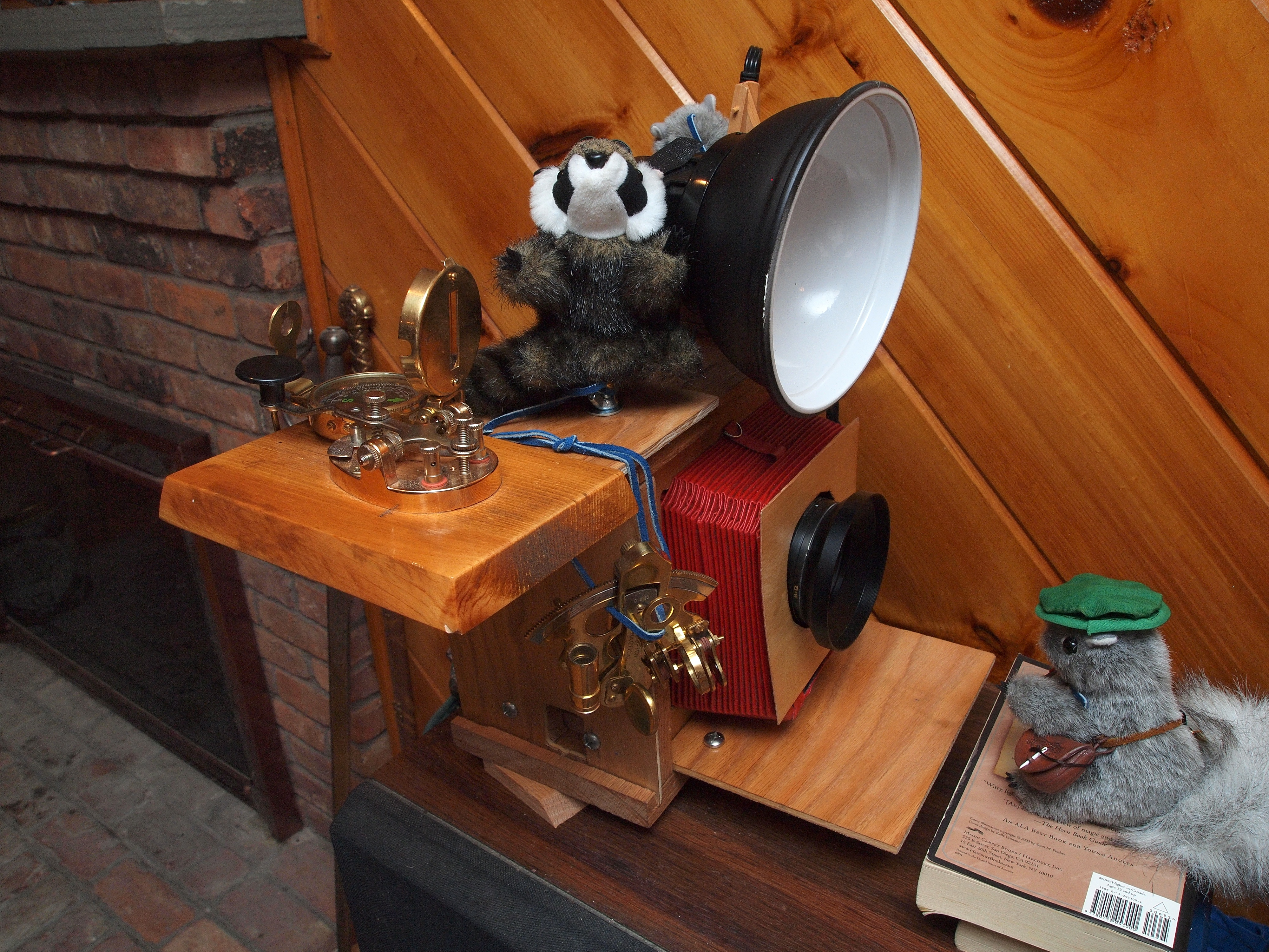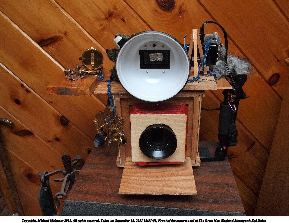 Picture #60: Front of the camera as used at The Great New England Steampunk Exhibition Small: 900x698, 116,099 bytes (114K), (html file) Large: 3600x2700, 5,121,793 bytes (4.9M), (html file) Copyright, Michael Meissner 2011, All rights reserved Olympus E-P2 camera with Olympus-m43 14-42mm f/3.5-5.6 lens f/4.0, ISO 200, FL-36 flash (+0.33 flash compensation), 1/60 sec, 19.0mm, auto mode, vivid color, auto gradation, SHQ, matrix metering, IS1 (All Direction Shake IS), noise reduction auto, noise filter low 35mm equivalent focal length 38.0mm Extra equipment used: Olympus FL-36 flash Programs used: rawtherapee Taken by Michael Meissner on September 18, 2011 18:30:01 Last modified on September 18, 2011 at 22:39 This picture is one of my favorites. |