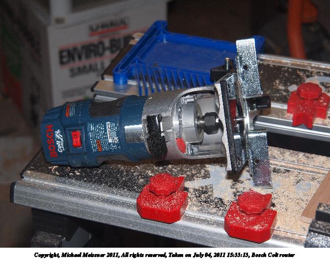 Picture #74: Bosch Colt router Small: 672x527, 89,842 bytes (88K), (html file) Large: 4032x3024, 8,403,118 bytes (8.0M), (html file) Copyright, Michael Meissner 2011, All rights reserved Olympus E-P2 camera with Olympus-m43 14-150mm f/4.0-5.6 lens f/5.4, ISO 200, FL-36 flash (+0.33 flash compensation), 1/100 sec, 47.0mm, auto mode, vivid color, SHQ, matrix metering, auto + manual focus, IS1 (All Direction Shake IS) 35mm equivalent focal length 94.0mm Extra equipment used: Olympus FL-36 flash Taken by Michael Meissner on July 04, 2011 15:33:13 Last modified on July 04, 2011 at 23:30 I bought the router over the 4th of July weekend to cut better groves than I was able to do with the table saw, and to replace the use of a coping saw and jig saw for doing interior cuts. |