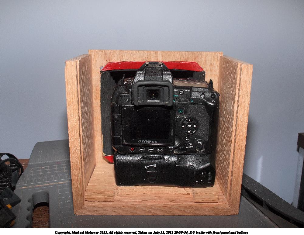Picture #17: Front view with E-3 and bellows installed Small: 1000x773, 119,653 bytes (117K), (html file) Large: 4000x3000, 3,968,931 bytes (3.8M), (html file) Copyright, Michael Meissner 2011, All rights reserved Olympus E-P2 camera with Olympus-m43 14-150mm f/4.0-5.6 lens f/8.0, ISO 200, FL-36 flash (+0.33 flash compensation), 1/60 sec, 18.0mm, aperture priority, vivid color, auto gradation, SHQ, matrix metering, auto + manual focus, IS1 (All Direction Shake IS) 35mm equivalent focal length 36.0mm Extra equipment used: Olympus FL-36 flash Programs used: raw therapee Taken by Michael Meissner on July 31, 2011 20:41:01 Last modified on July 31, 2011 at 22:46 |